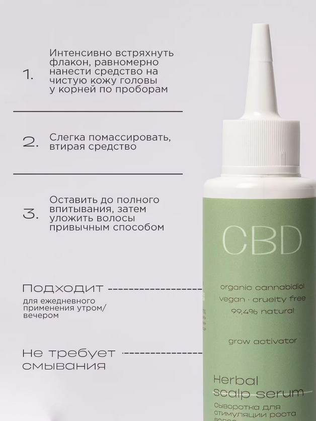 Натуральная формула сыворотки для роста волос с каннабидиолом (CBD) улучшает микроциркуляцию и питание корней волос, стимулируя их естественный рост.