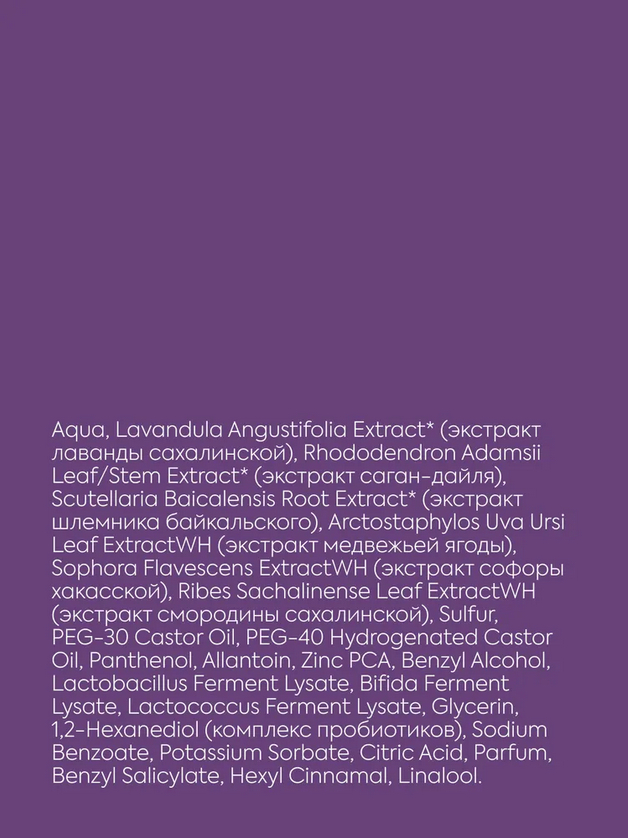 Aqua, Lavandula Angustifolia Extract* (экстракт лаванды сахалинской), Rhododendron Adamsii Leaf/Stem Extract* (экстракт саган-дайля), Scutellaria Baicalensis Root Extract* (экстракт шлемника байкальского), Arctostaphylos Uva Ursi Leaf ExtractWH (экстракт медвежьей ягоды), Sophora Flavescens ExtractWH (экстракт софоры хакасской), Ribes Sachalinense Leaf ExtractWH (экстракт смородины сахалинской), Sulfur, PEG-30 Castor Oil, PEG-40 Hydrogenated Castor Oil, Panthenol, Allantoin, Zinc PCA, Benzyl Alcohol, Lactobacillus Ferment Lysate, Bifida Ferment Lysate, Lactococcus Ferment Lysate, Glycerin, 1,2-Hexanediol (комплекс пробиотиков), Sodium Benzoate, Potassium Sorbate, Citric Acid, Parfum, Benzyl Salicylate, Hexyl Cinnamal, Linalool.