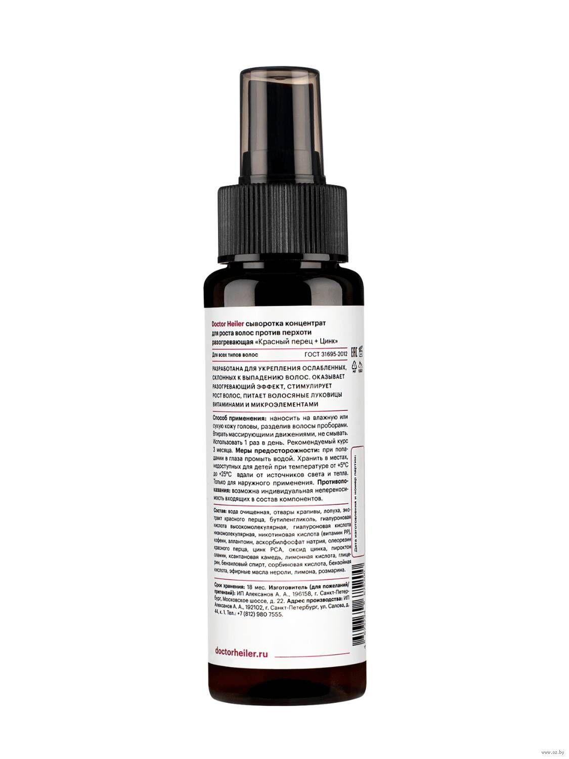 Вода очищенная, отвары крапивы, лопуха, бутиленгликоль, масло репейное, никотиновая кислота (витамин РР), экстракт красного перца, гиалуроновая кислота высокомолекулярная, гиалуроновая кислота низкомолекулярная, кофеин, аллантоин, пантенол, аскорбилфосфат натрия, олеорезин красного перца, ксантановая камедь, лимонная кислота, глицерин, бензиловый спирт, сорбиновая кислота, бензойная кислота, эфирные масла нероли, лимона, розмарина.