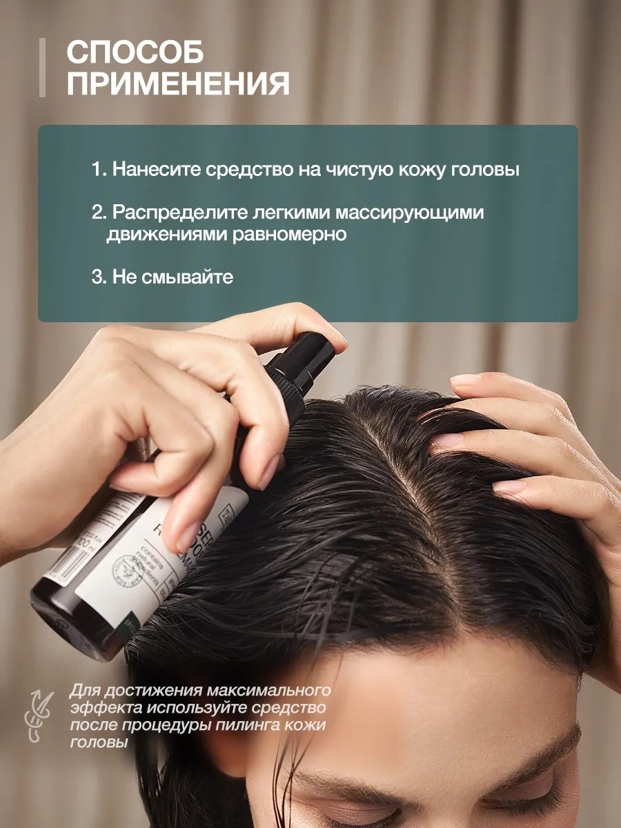Нанесите средство на чистую кожу головы, распределите легкими массирующими движениями равномерно. Не смывайте. Для достижения максимального эффекта используйте средство после процедуры пилинга кожи головы.Состав