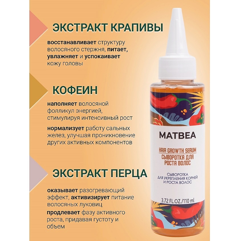 Экстракт перца оказывает разогревающий эффект, активизирует питание волосяных луковиц. Продлевает фазу активного роста, придавая густоту и объем.