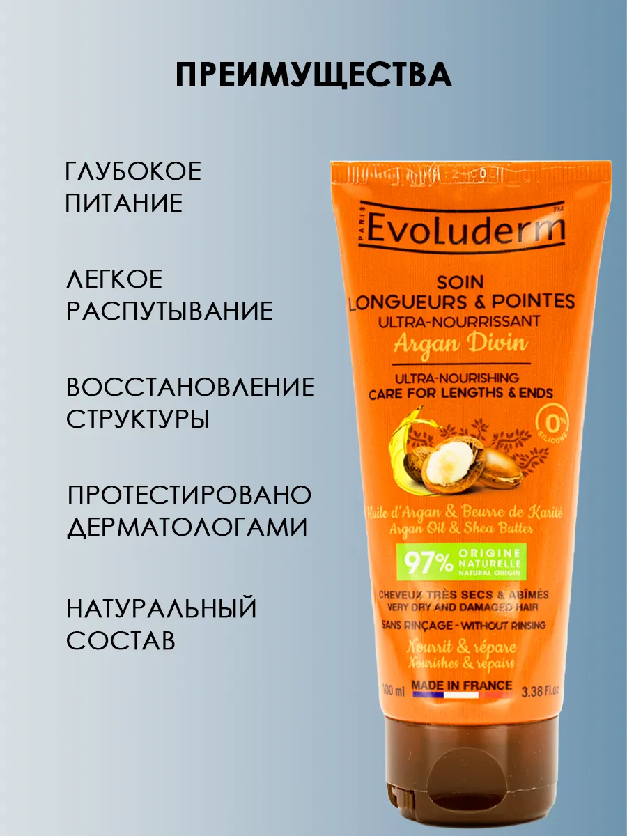 Не содержащее силикона и специально разработанное для ухода за очень сухими и поврежденными волосами, это средство обогащено марокканским маслом арганы и маслом ши из Буркина-Фасо. Сочетание эти двух драгоценных ингредиентов в ультра-богатой кремообразной формуле защищает и укрепляют волосы по всей длине и мгновенно восстанавливает кончики волос. Структура волос покрыта оболочкой, и вьющиеся волосы приручены.