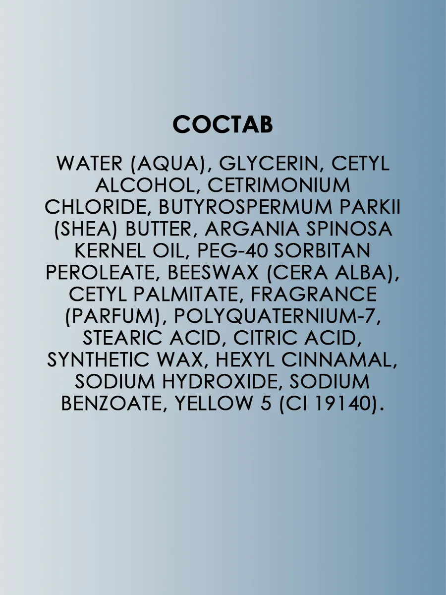 Aqua, Glycerin, Cetearyl Alcohol, Cetyl Alcohol, Butyrospermum Parkii Butter, Glyceryl Stearate, Peg-100 Stearate, Cetrimonium Chloride, Phenoxyethanol, Panthenol, Perfume, Argania Spinosa Kernel Oil, Polyquaternium-37, Chlorphenesin, Polyquaternium-7, Hexyl Cinnamal, Citric Acid, Isopropyl Alcohol, Sodium Benzoate, Sodium Hydroxide, Ci 19140.Мы используем файлы cookie для обеспечения удобства работы с сайтом и его контакта с пользователем.