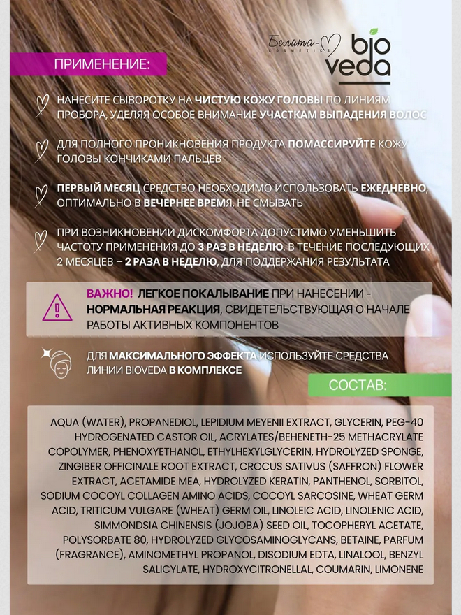 Нанесите сыворотку на чистую кожу головы по линиям пробора, уделяя особое внимание участкам выпадения волос. Для полного проникновения продукта помассируйте кожу головы кончиками пальцев. Первый месяц средство необходимо использовать ежедневно, оптимально в вечернее время, не смывать. При возникновении дискомфорта допустимо уменьшить частоту применения до 3 раз в неделю. В течение последующих 2 месяцев – 2 раза в неделю, для поддержания результата. Важно! Легкое покалывание при нанесении - нормальная реакция, свидетельствующая о начале работы активных компонентов.Состав