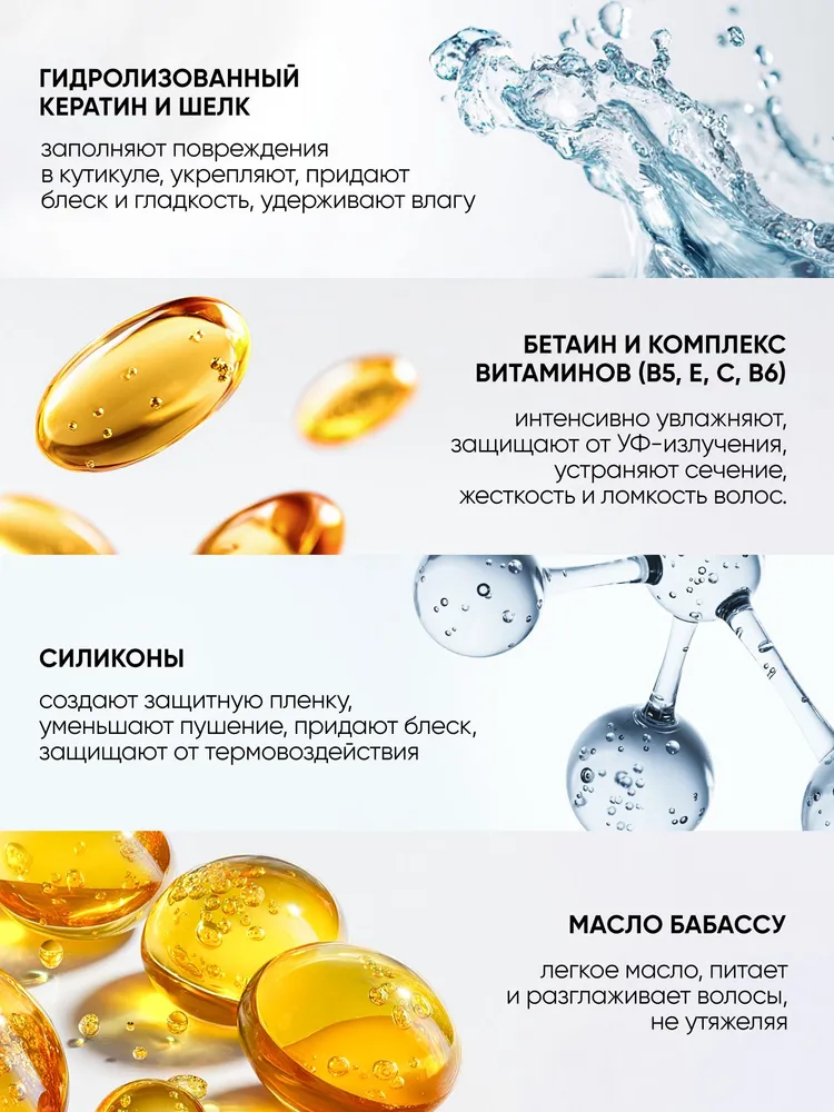 | Эффект | Блеск, восстановление, защита от негативных факторов внешней среды, легкое расчесывание, мягкость, не утяжеляет волосы, питание, против ломкости, против пушистости, термозащита, укрепление |