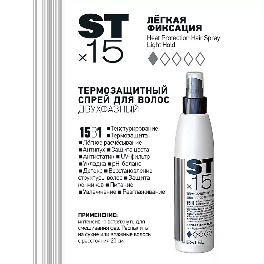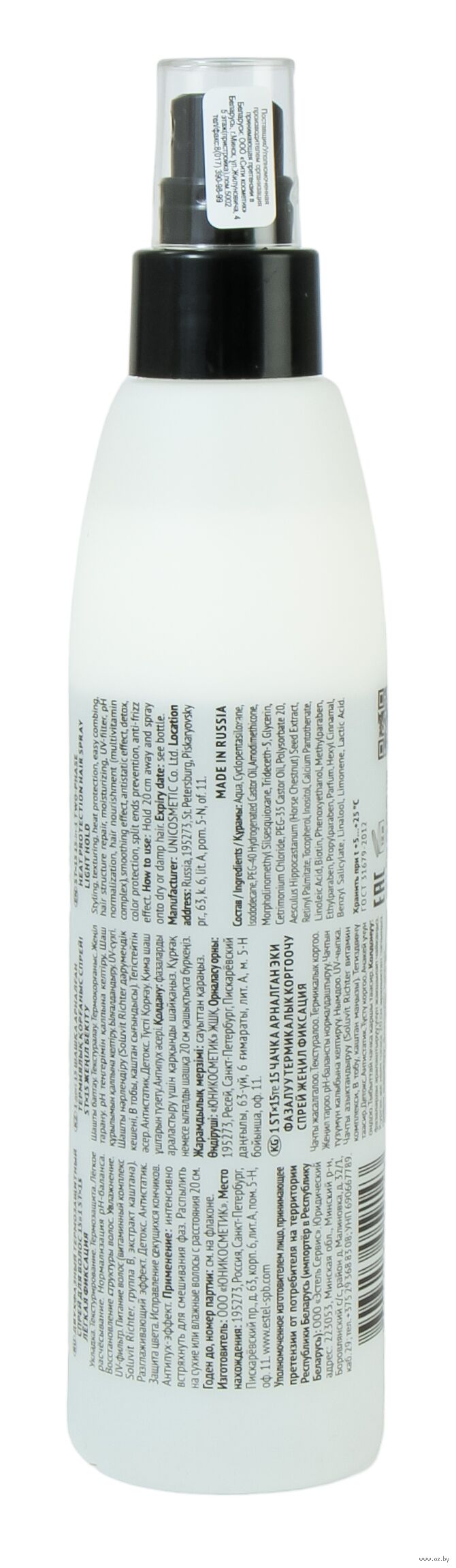 Интенсивно встряхнуть для смешивания фаз. Распылить на сухие или влажные волосы с расстояния 20 см.Состав