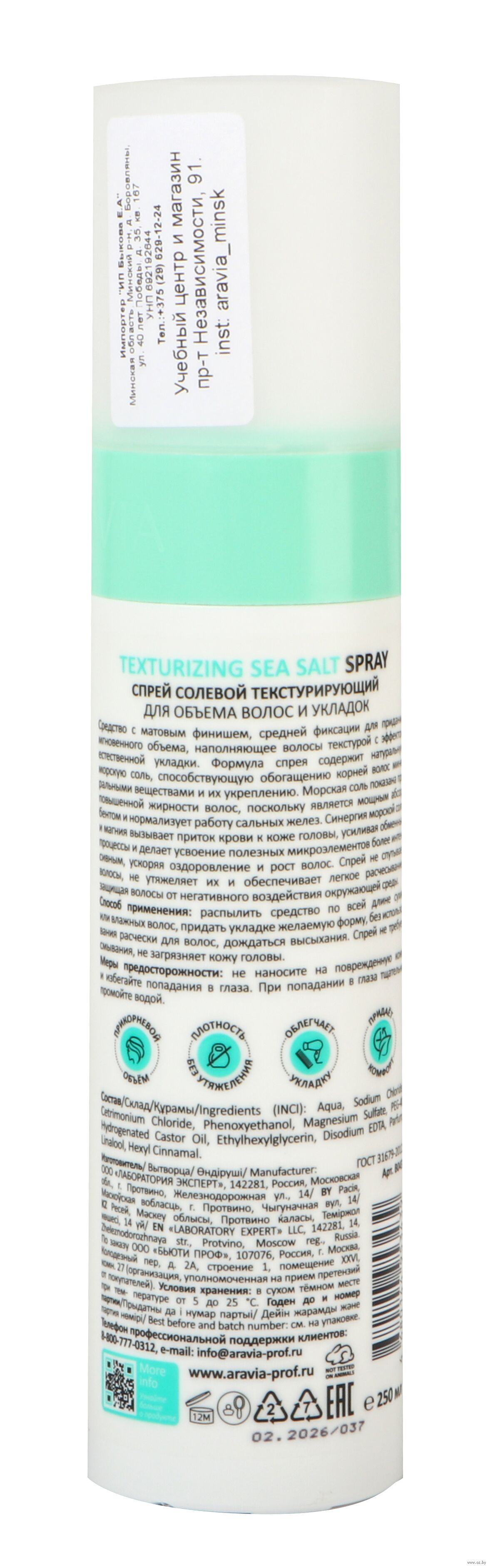Формула спрея содержит натуральную морскую соль, способствующую обогащению корней волос минеральными веществами и их укреплению. Морская соль показана при повышенной жирности волос, поскольку является мощным абсорбентом и нормализует работу сальных желез. Синергия морской соли и магния вызывает приток крови к коже головы, усиливая обменные процессы, и делает усвоение полезных микроэлементов более интенсивным, ускоряя оздоровление и рост волос. Спрей не спутывает волосы, не утяжеляет их и обеспечивает легкое расчесывание, защищая волосы от негативного воздействия окружающей среды.