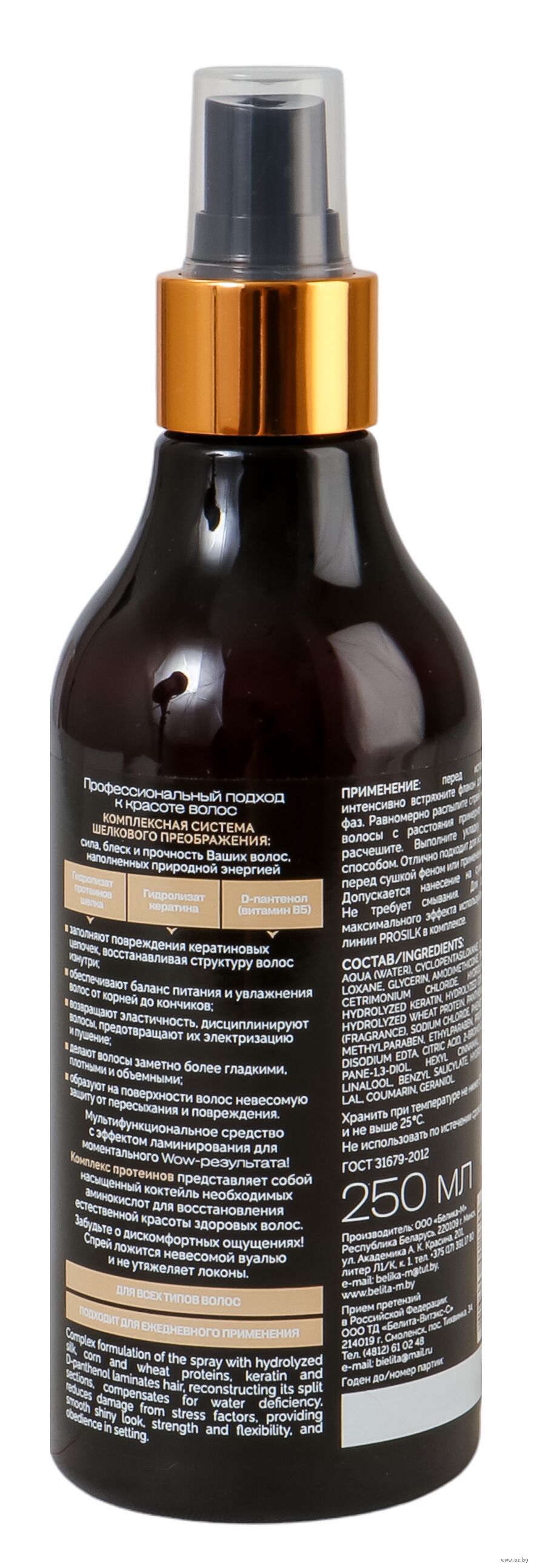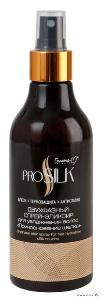 Перед использованием интенсивно встряхните флакон для смешения фаз. Равномерно распылите спрей на вымытые волосы с расстояния примерно 20-30 см, расчешите. Выполните укладку привычным способом. Отлично подходит для использования перед сушкой феном или применением утюжка. Допускается нанесение на сухие волосы. Не требует смывания. Для достижения максимального эффекта используйте средства линии PROSILK в комплексе.Состав