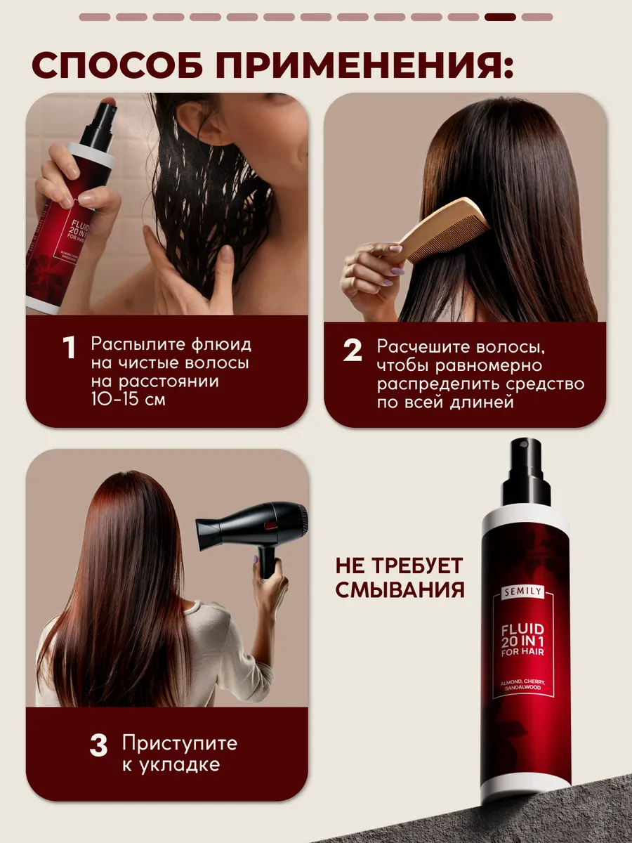 С помощью распылителя обильно нанесите спрей для волос на чистые и подсушенные полотенцем волосы, избегая прикорневой зоны. Не смывая, уложите волосы.Состав