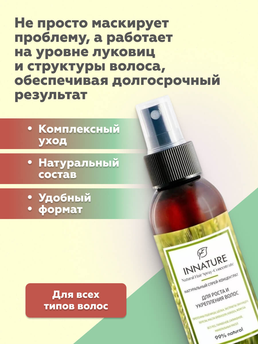 Натуральный спрей-концентрат содержит биологически активные компоненты для роста и укрепления волос – гидролизованные протеины пшеницы и экстракт эхинацеи, которые воздействуют на волосяные луковицы и активизируют кровообращение в коже головы. Гидролизованные протеины пшеницы укрепляют, проникая в стержень волос и заполняя пустоты в их структуре.