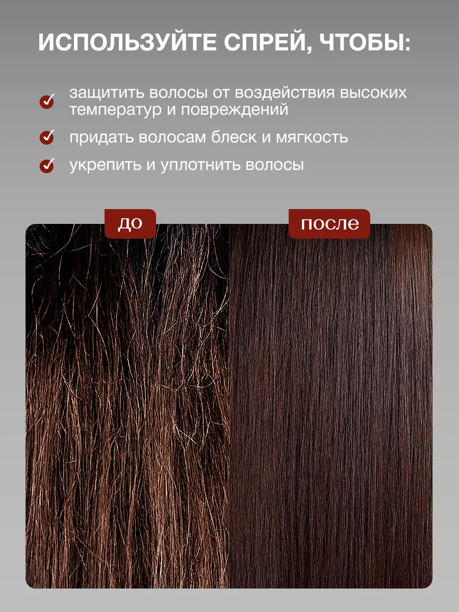 Спрей имеет легкую, невесомую текстуру, которая не утяжеляет и не склеивает волосы, делает их рассыпчатыми и живыми. Подходит для ежедневного использования как на влажные, так и на сухие волосы.