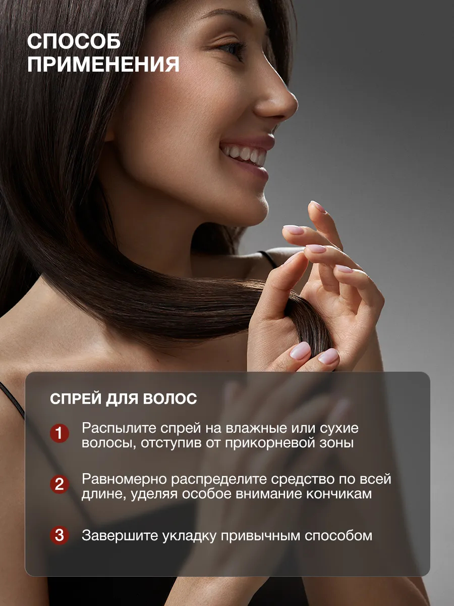 Распылите спрей на влажные или сухие волосы, отступив от прикорневой зоны. Равномерно распределите средство по всей длине, уделяя особое внимание кончикам. Завершите укладку привычным способом.Состав