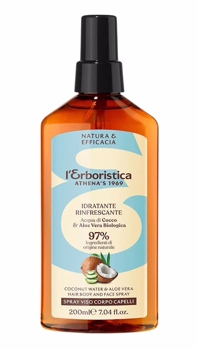 Увлажняющий спрей для лица, тела и волос, не содержащий спирта, с нежным ароматом кокоса. Он сочетает в себе необыкновенное освежающее действие кокосовой воды с увлажняющими и успокаивающими свойствами чистого органического сока алоэ вера.