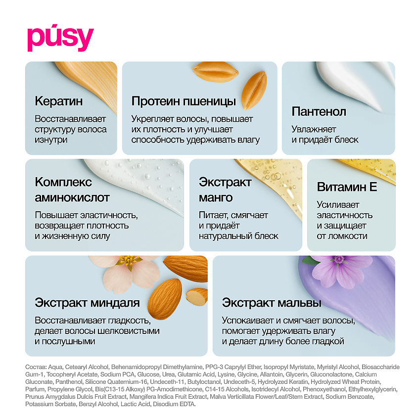 Aqua, Cetearyl Alcohol, Behenamidopropyl Dimethylamine, PPG-3 Caprylyl Ether, Isopropyl Myristate, Myristyl Alcohol, Biosaccharide Gum-1, Tocopheryl Acetate, Sodium PCA, Glucose, Urea, Glutamic Acid, Lysine, Glycine, Allantoin, Glycerin, Gluconolactone, Calcium Gluconate, Panthenol, Silicone Quaternium-16, Undeceth-11, Butyloctanol, Undeceth-5, Hydrolyzed Keratin, Hydrolyzed Wheat Protein, Parfum, Propylene Glycol, Bis(C13-15 Alkoxy) PG-Amodimethicone, C14-15 Alcohols, Isotridecyl Alcohol, Phenoxyethanol, Ethylhexylglycerin, Prunus Amygdalus Dulcis Fruit Extract, Mangifera Indica Fruit Extract, Malva Verticillata Flower/Leaf/Stem Extract, Sodium Benzoate, Potassium Sorbate, Benzyl Alcohol, Lactic Acid, Disodium EDTA.Мы используем файлы cookie для обеспечения удобства работы с сайтом и его контакта с пользователем.