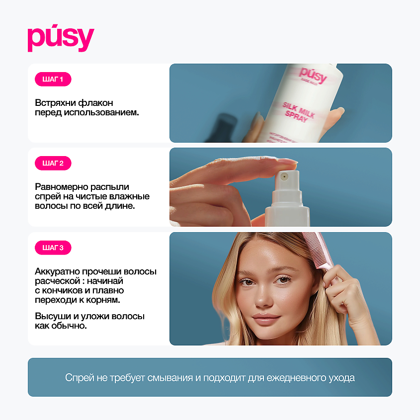 Встряхните флакон перед использованием, равномерно распылите спрей на чистые, влажные или сухие волосы. Аккуратно расчешите волосы с помощью расчески с редкими зубьями, начиная с кончиков и постепенно переходя к корням. Высушите и уложите волосы в привычном режиме.Состав