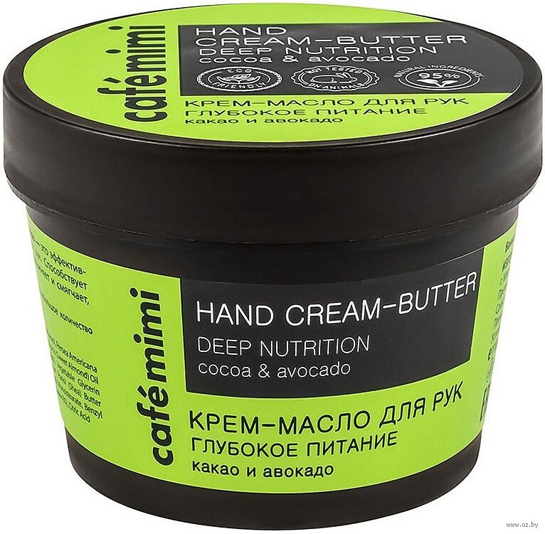 Aqua, Theobroma Cacao Seed Butter (масло Какао), Persea Americana (Avocado) exract (экстракт Авокадо), Stearic Acid, Prunus Amygdalus Dulcis (Sweet Almond) Oil (масло Миндаля), Persea Gratissima (Avocado) Oil (масло Авокадо), Vegetable Glycerin (растительного происхождения), Isopropyl Myristate, Butyrospermum Parkii (Shea) Butter (масло Ши), Betaine (из сахарной свеклы), Cetearyl Alcohol, Glyceryl Monostearate, Benzyl Alcohol, Benzoic Acid, Dehydroacetic Acid, Perfume, Panthenol (провитамин В5), Citric Acid.