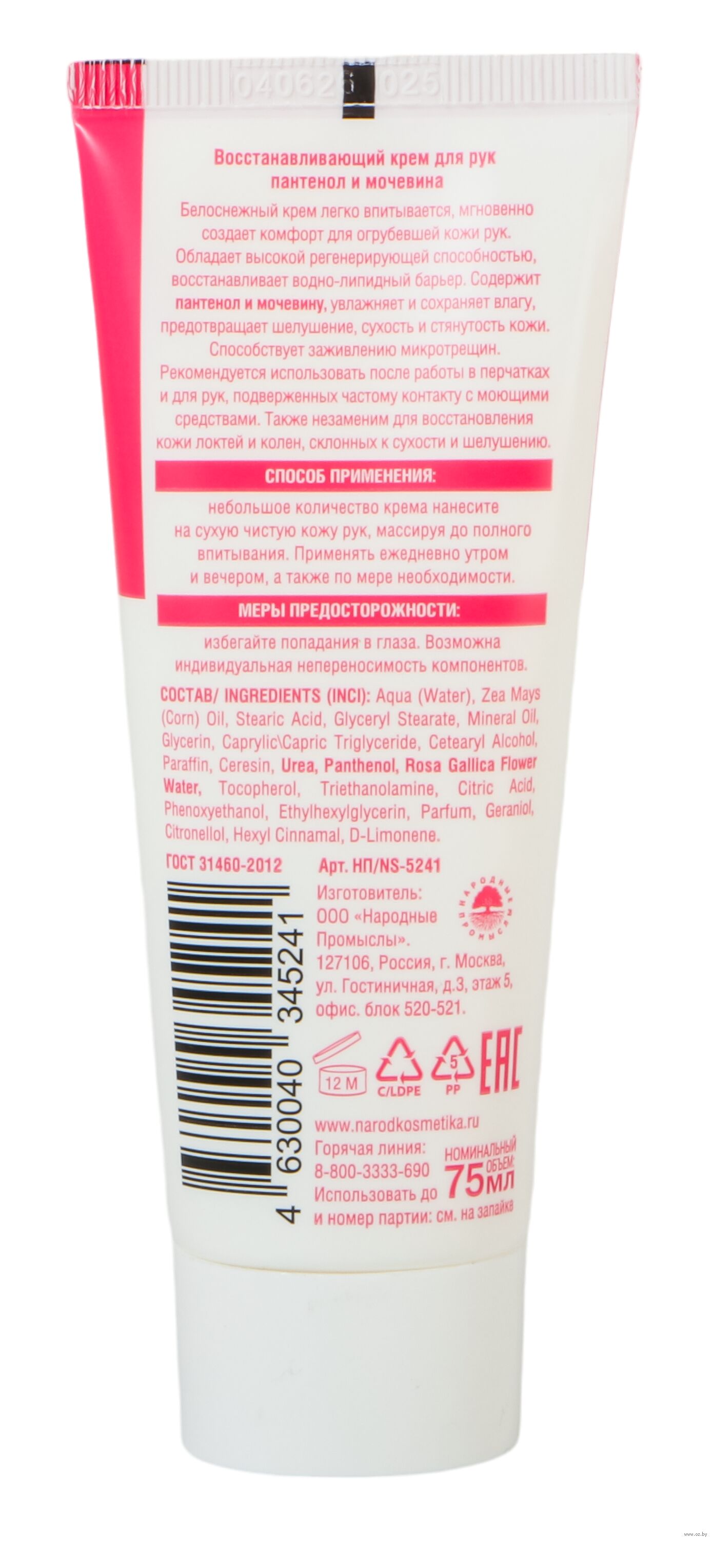 Содержит пантенол и мочевину (NMF), увлажняет и сохраняет влагу, предотвращает шелушение, сухость и стянутость кожи. Способствует заживлению микротрещин. Рекомендуется использовать после работы в перчатках и для рук, подверженных частому контакту с моющими средствами. Также незаменим для ухода за кожей локтей и колен.