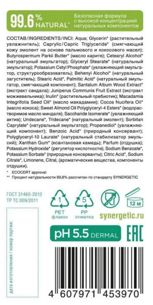 Aqua, Glycerin (растительный увлажнитель), Caprylic/Capric Triglyceride (смягчающий кожу эмолент на основе пальмового и кокосового масел), Butyrospermum Parkii Butter (масло карите), Cetearyl Alcohol (натуральный эмульгатор), Glyceryl Stearate (натуральный эмульгатор), Potassium Cetyl Phosphate (увлажняющий эмульгатор, структурообразователь), Behenyl Alcohol (натуральный загуститель), Stearic Acid, Palmitic Acid (натуральный эмульгатор, смягчающий компонент), Santalum Album Wood Extract (экстракт сандала), Juniperus Communis Fruit Extract (экстракт можжевельника), Inulin (растительный пребиотик), Macadamia Integrifolia Seed Oil (масло макадамии), Cocos Nucifera Oil (масло кокоса), Sweet Almond Oil Polyglyceryl-4 Esters (водорастворимое масло миндаля), Saccharide Isomerate (увлажняющий актив), Undecane, Tridecane (натуральный эмолент), Sorbitan Caprylate (натуральный эмульгатор), Propanediol (увлажняющий компонент), Benzoic Acid (природный консервант), Polyglyceryl-10 Laurate (натуральный стабилизатор эмульсий), Xanthan Gum (ксантановая камедь), Parfum (отдушка), Potassium Hydroxide (регулятор кислотности), Sodium Benzoate, Potassium Sorbate (природные консерванты), Citric Acid, Sodium Citrate, Limonene, Citral, (ароматические вещества, компоненты отдушки).