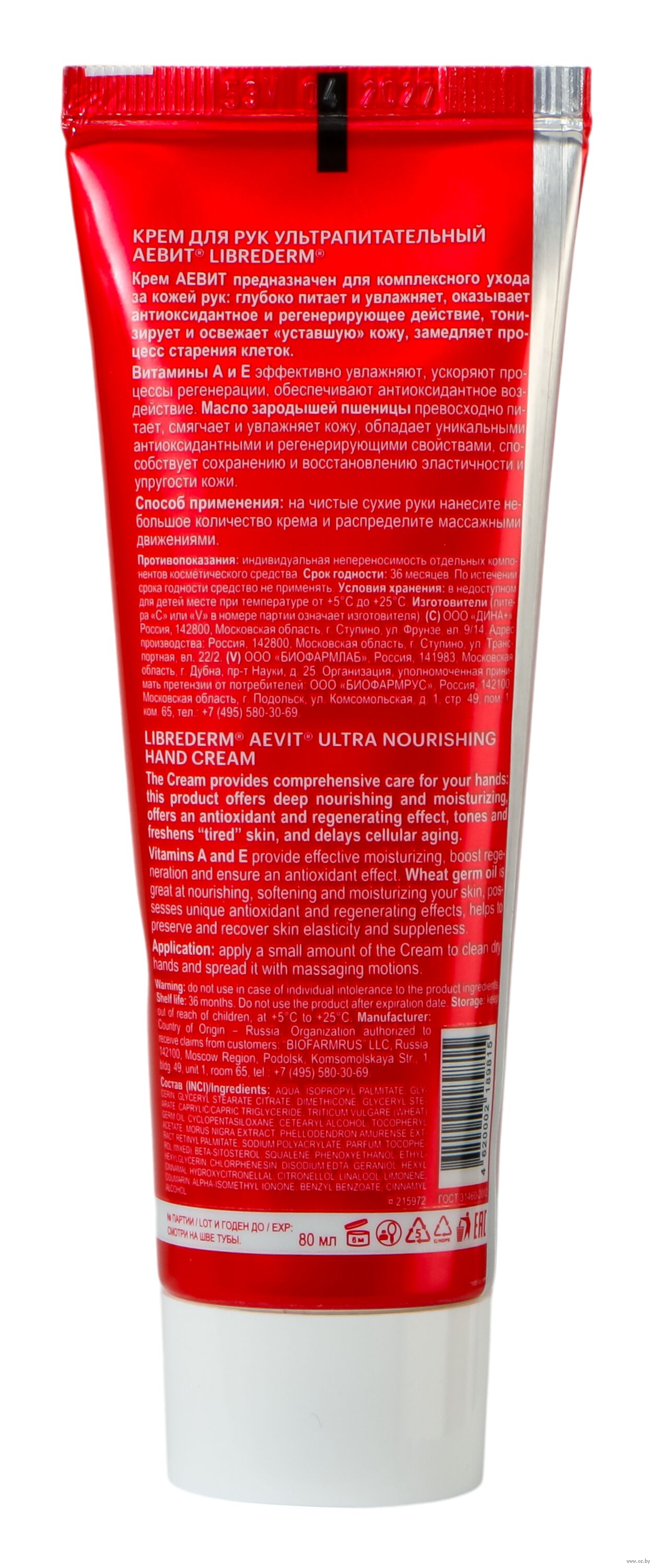 Крем для рук "Ультрапитательный" "АЕВИТ" Librederm увлажняет кожу, отлично питает, поддерживает молодость и упругость кожных покровов, а также оказывает антиоксидантное и регенерирующее действие, защищая от воздействия вредных внешних факторов. Благодаря применению крема, ваша кожа рук становится нежной, бархатной и шелковистой.