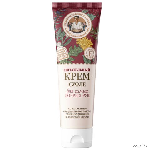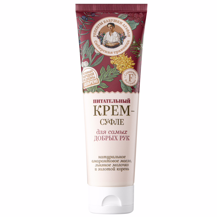Крем-суфле с витамином F буквально тает на коже, быстро впитывается, глубоко питает и смягчает кожу, защищает от неблагоприятного воздействия внешних факторов и дарит ухоженный вид. Витамин F – природный липид, обновлению клеток способствует, делает кожу упругой и эластичной. Амарантовое масло поддерживает гидролипидный барьер и повышает эластичность и упругость кожи. Льняное молочко балует ваши ручки витаминами и микроэлементами, замечательно увлажняет, придаёт бархатистую гладкость и нежность. Экстракт золотого корня выработку коллагена стимулирует, удерживает в коже влагу, уменьшает действие свободных радикалов, снабжение клеток кислородом улучшает.