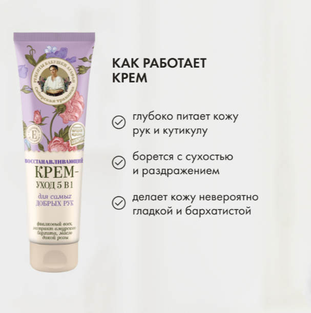 Крем-уход 5 в 1 с витамином Е прекрасно смягчает, защищает, увлажняет и питает кожу рук и ногтей. Он эффективно борется с сухостью и раздражением на коже, делая её невероятно гладкой и бархатистой.
