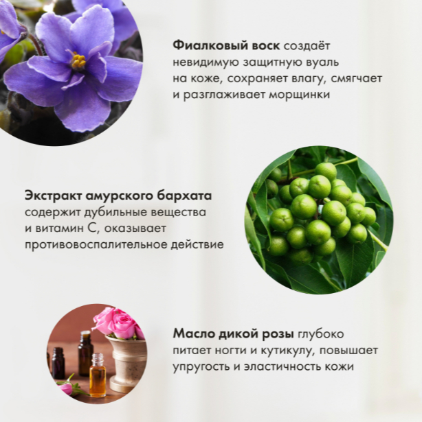 Витамин Е – первый антиоксидант среди витаминов, легко проникает в клетки кожи, от старения защищает, процессы восстановления активирует. Фиалковый воск создаёт невидимую защитную вуаль на коже, защищает от потери влаги, способствует её восстановлению, смягчает и разглаживает мелкие морщинки. Экстракт амурского бархата содержит дубильные вещества, витамин С и никотиновую кислоту, которые оказывают противовоспалительное действие на кожу. Масло дикой розы глубоко питает ногти, кутикулу и кожу рук, стимулирует обновление клеток кожи, повышает упругость и эластичность.