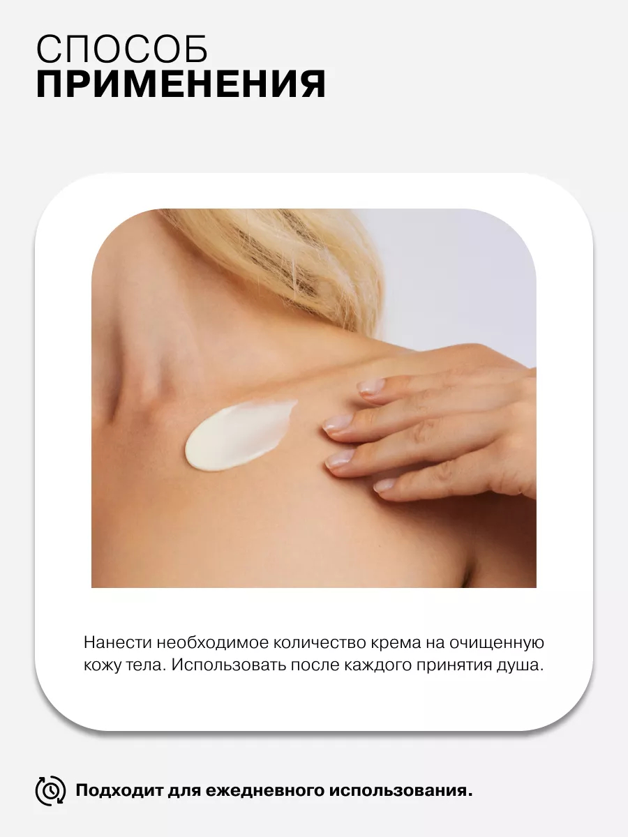 Нанести необходимое количество крема на очищенную кожу тела. Использовать после каждого принятия душа. Подходит для регулярного применения.Состав