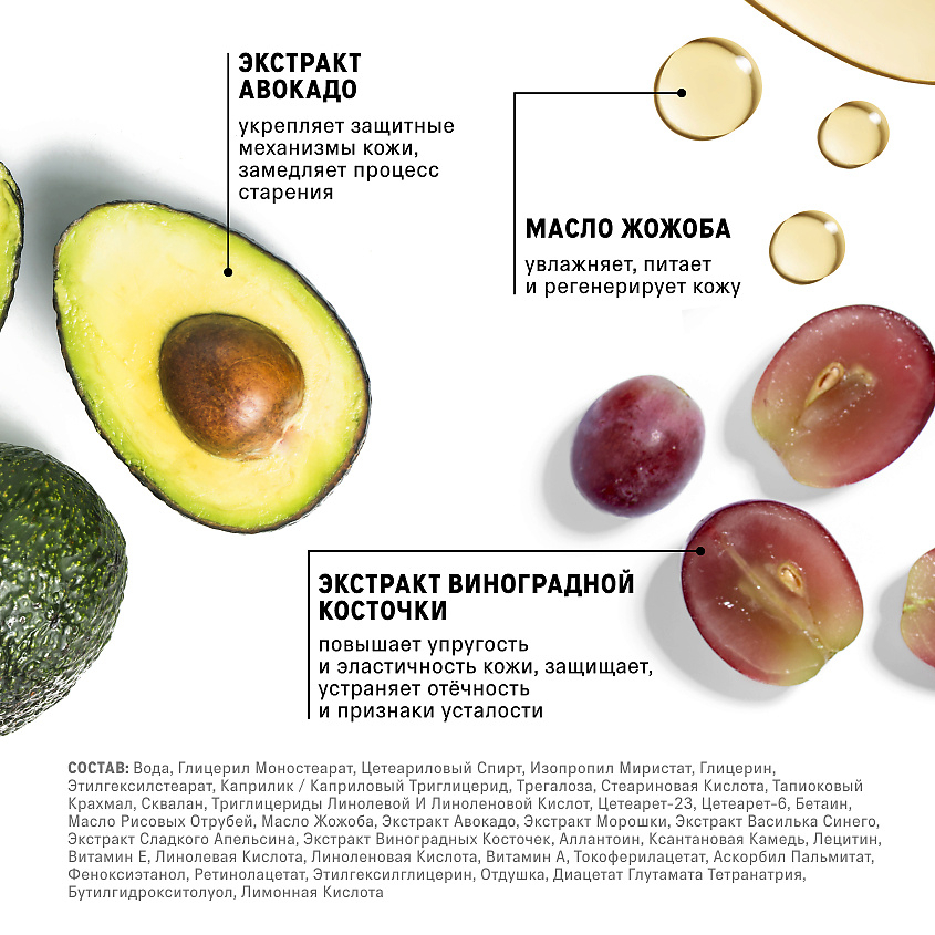 Aqua (Water), Glyceryl Monostearate, Cetylstearyl Alcohol, Isopropyl Miristate, Glycerin, Ethylhexyl Stearate, Caprylic/Capric Triglyceride, Trehalosa, Stearic Acid, Tapioca Starch, Squalane, Triglycerides of linoleic and linolenic acids, Ceteareth-23, Ceteareth-6, Betaine, Oryza Sativa (Rice) Bran Oil, Simmondsia Chinensis (Jojoba) Seed Oil, Persea Gratissima (Avocado) Fruit Extract, Rubus Chamaemorus (Cloudberry) Fruit Extract, Centaurea Cyanus (Cornflower) Flower Extract, Citrus Sinensis (Orange) Peel Extract, Vitis Vinifera (Grape) Seed Extract, Allantoin, Xanthan Gum, Lecithin, Tocopherol, Linoleic Acid, Linolenic Acid, Retinyl Palmitate, Tocopheryl Acetate, Ascorbyl Palmitate, Phenoxyethanol, Retinyl Acetate, Ethylhexylglycerin, Fragrance, Tetrasodium Glutamate Diacetate, Butyl Hydroxytoluene (BHT), Citric Acid.