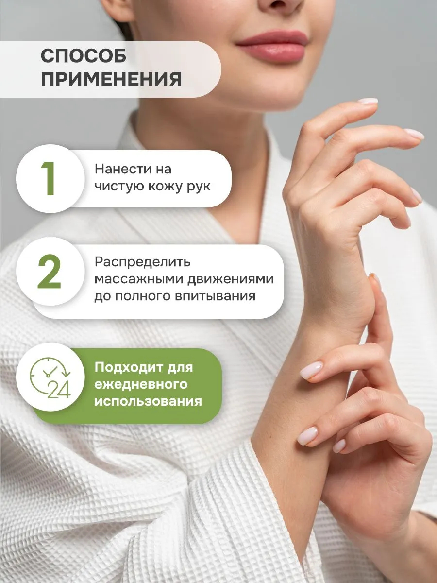 Нанести необходимое количество крема на чистую кожу рук мягкими массажными движениями. Подходит для ежедневного применения.Состав