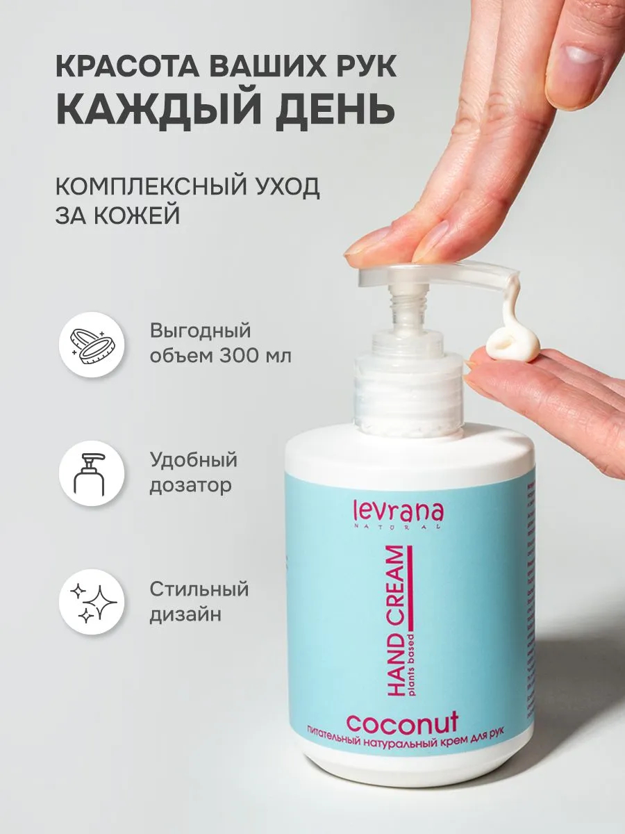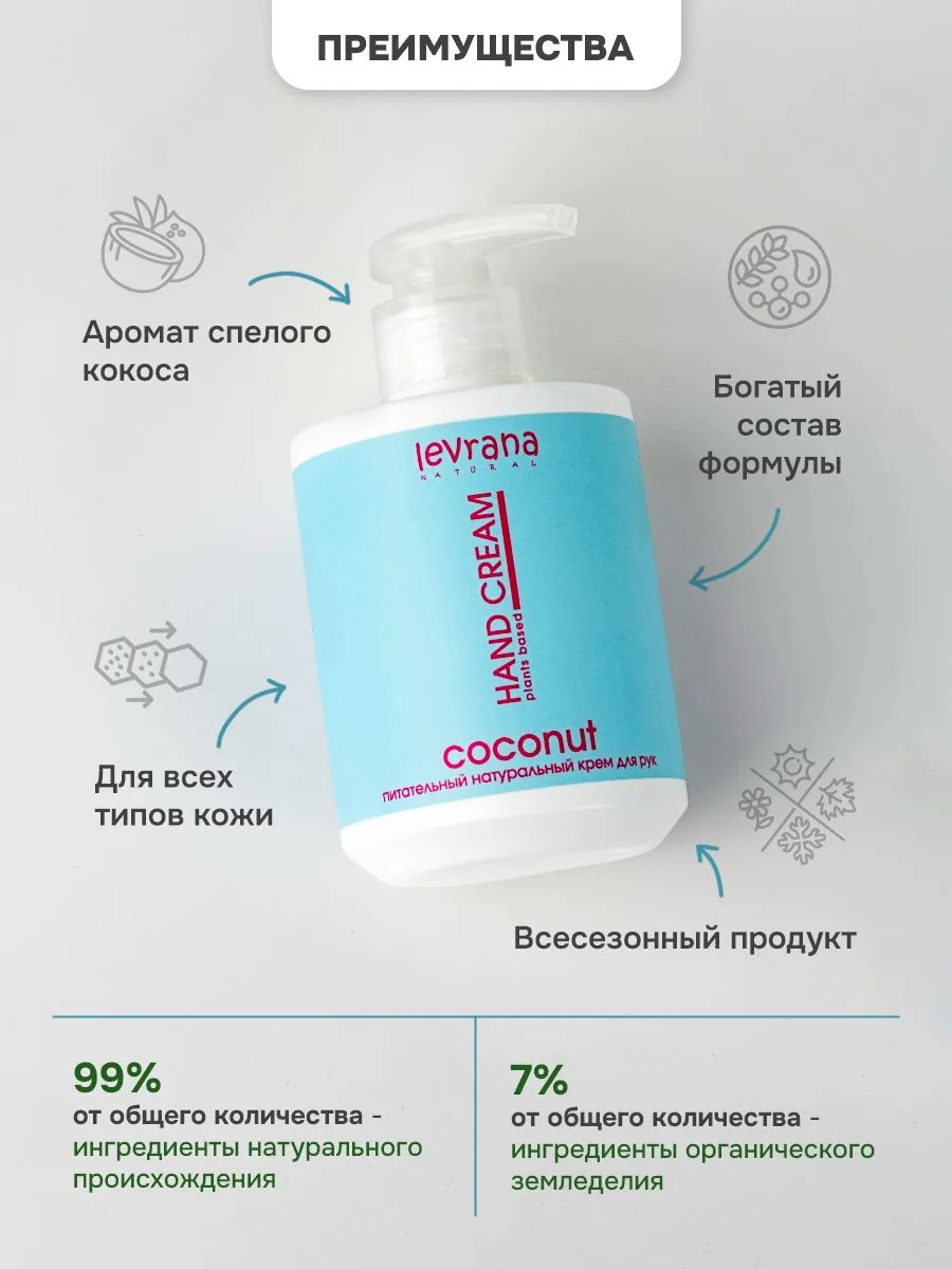 Натуральный питательный крем с ароматом кокоса эффективно увлажняет и смягчает кожу рук, защищая ее от негативных внешних воздействий.