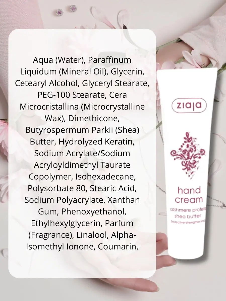 Aqua (Water), Paraffinum Liquidum (Mineral Oil), Glycerin, Cetearyl Alcohol, Glyceryl Stearate, Peg-100 Stearate, Cera Microcristallina (Microcrystalline Wax), Paraffin, Dimethicone, Butyrospermum Parkii (Shea Butter), Hydrolyzed Keratin, Sodium Acrylate/Sodium Acryloyldimethil Taurate Copolymer, Isohexadecane, Polysorbate 80, Stearic Acid, Sodium Polyacrylate, Xanthan Gum, Phenoxyethanol, Methylparaben, Ethylparaben, Propylene Glycol, Parfum (Fragrance), Linalool, Butylphenyl Methylpropional, Alpha-Isomethyl Lonone, Coumarin.
