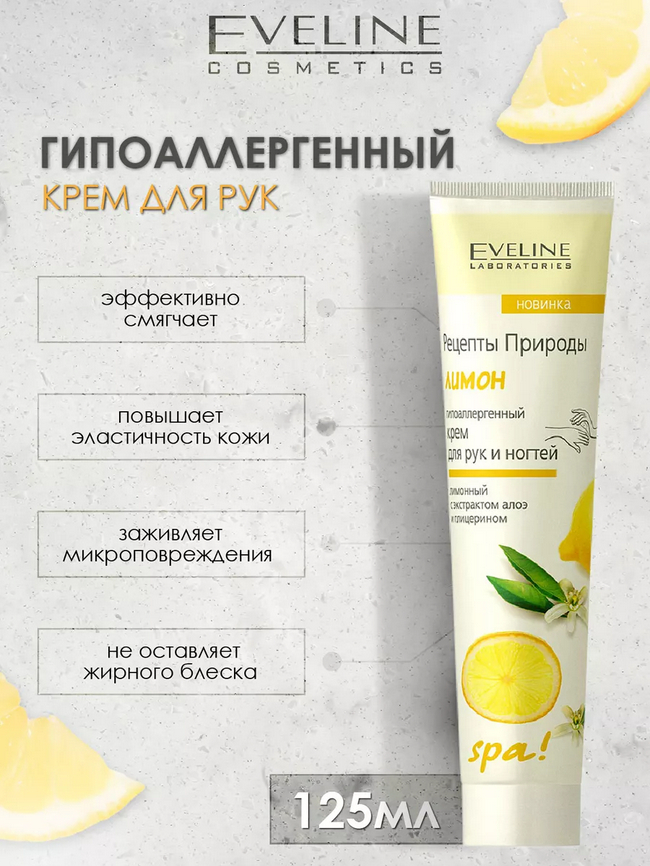 Инновационный, разработанный лабораторией Эвелин крем для ухода за кожей рук и ногтями, имеет необыкновенно нежную, легкую консистенцию и бодрящий аромат лимона. Предназначен для ухода за сухой, поврежденной и потресканной кожей рук. Идеален для тех, которые часто контактируют с моющими средствами и другими химикатами. Уже после первого использования улучшается состояние кожи рук.