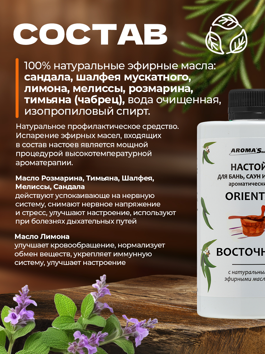 Применение полностью натуральных природных компонентов сделает приём паровой процедуры не просто ароматным и приятным, но и полезным для здоровья, т.к. испарение натуральных эфирных масел, входящих в состав настоев фактически является мощной процедурой высокотемпературной ароматерапии.