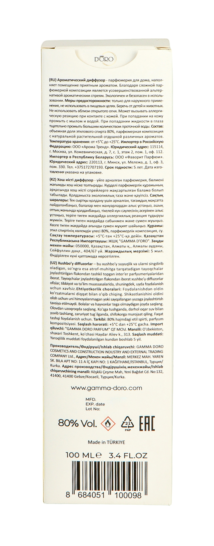 | Изготовитель | Gamma Doro Kozmetik Ve İnsaat Sanayi Ve Dis Ticaret Limited Sirketi, Merkez Mah. Yaren Sk. Bila Apt No: 11 A Ic Kapi No: 1 Kagithane, Istanbul, Turkey |