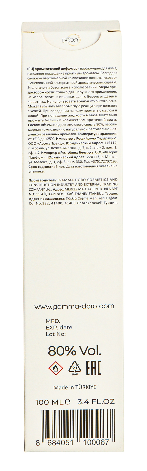 | Изготовитель | Gamma Doro Kozmetik Ve İnsaat Sanayi Ve Dis Ticaret Limited Sirketi, Merkez Mah. Yaren Sk. Bila Apt No: 11 A Ic Kapi No: 1 Kagithane, Istanbul, Turkey |