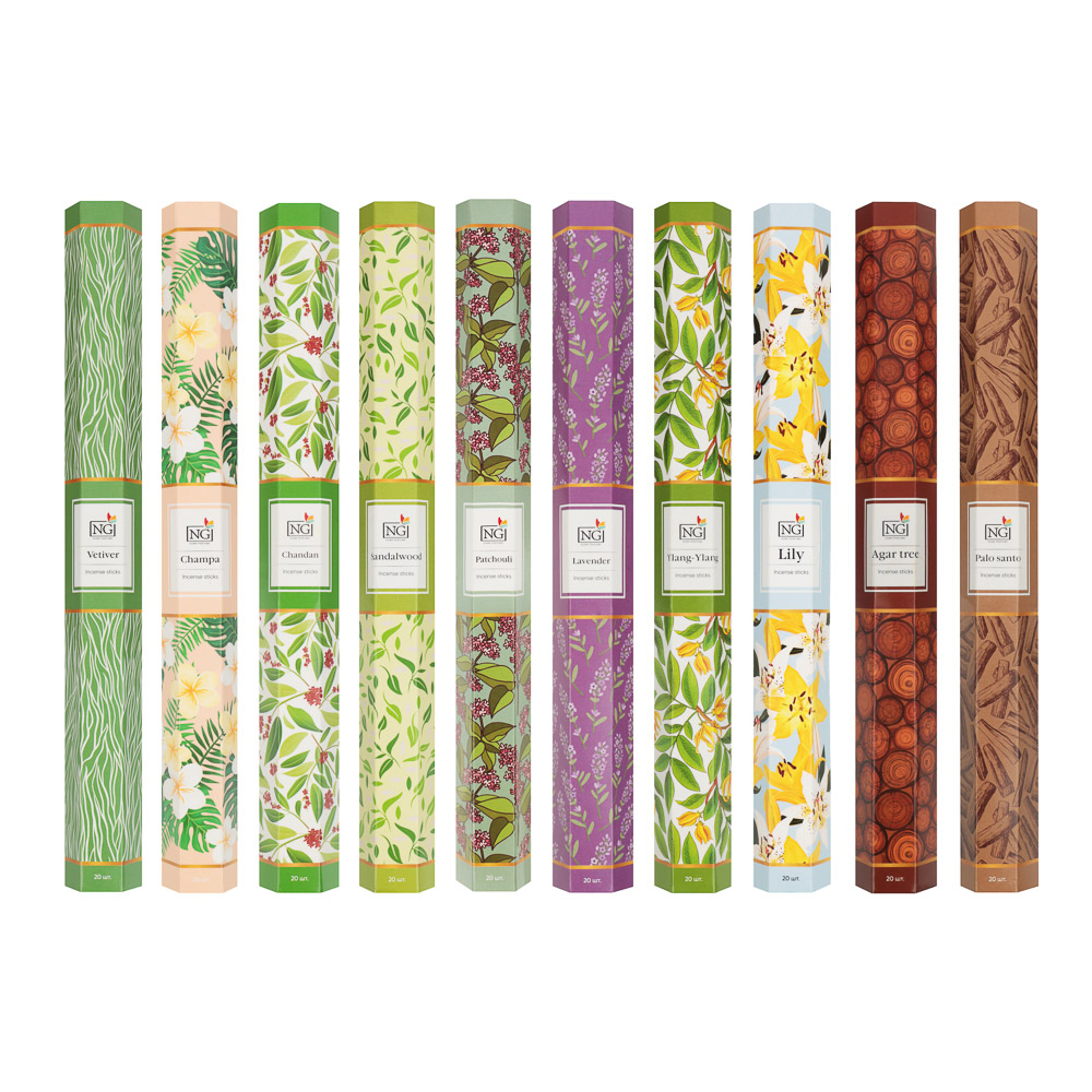 Аромат: Ветивер, Иланг, Лилия, Пачули, Сандал, Чампа, Чандан, Пало Санто, Агар, Лаванда.