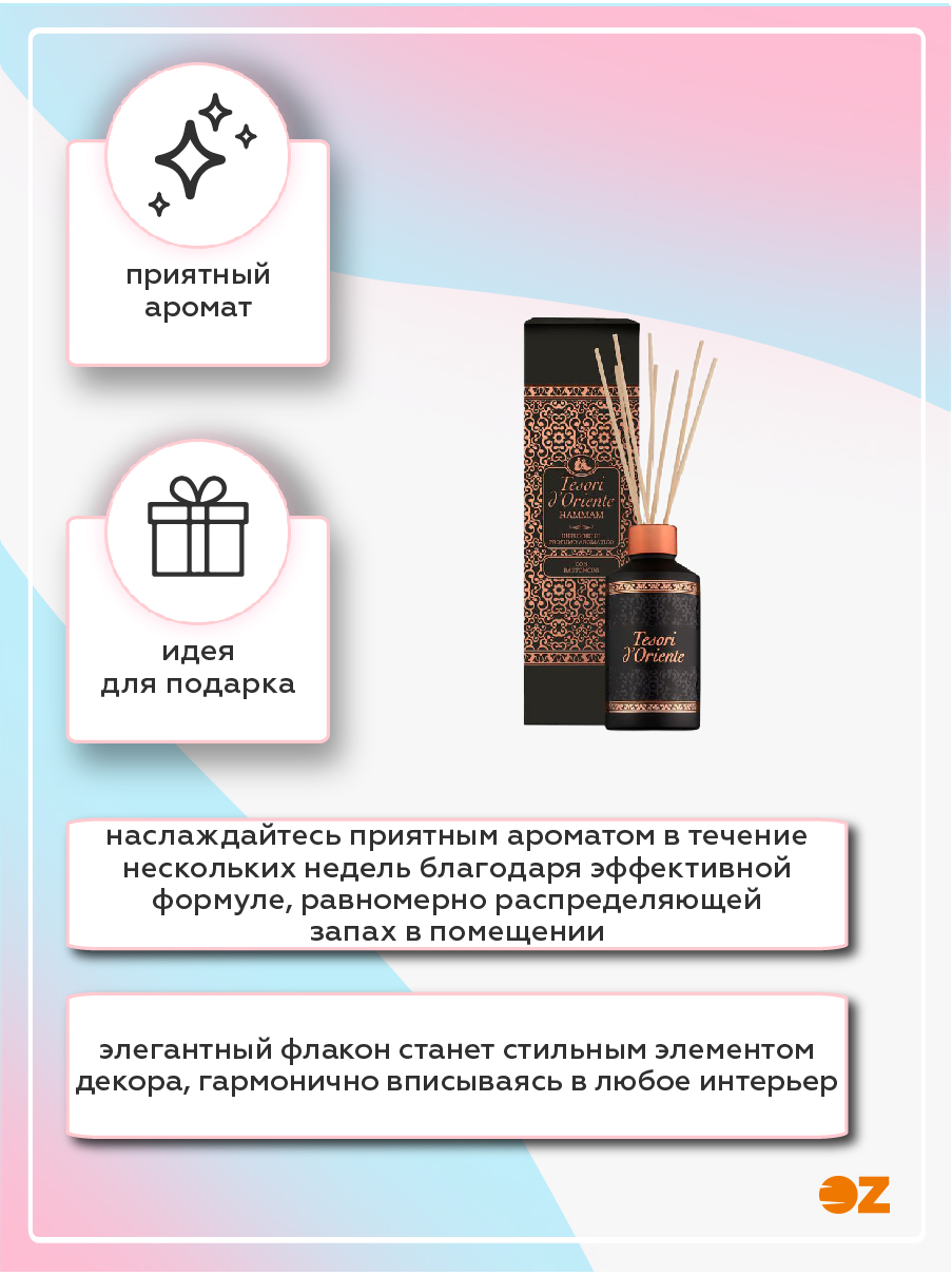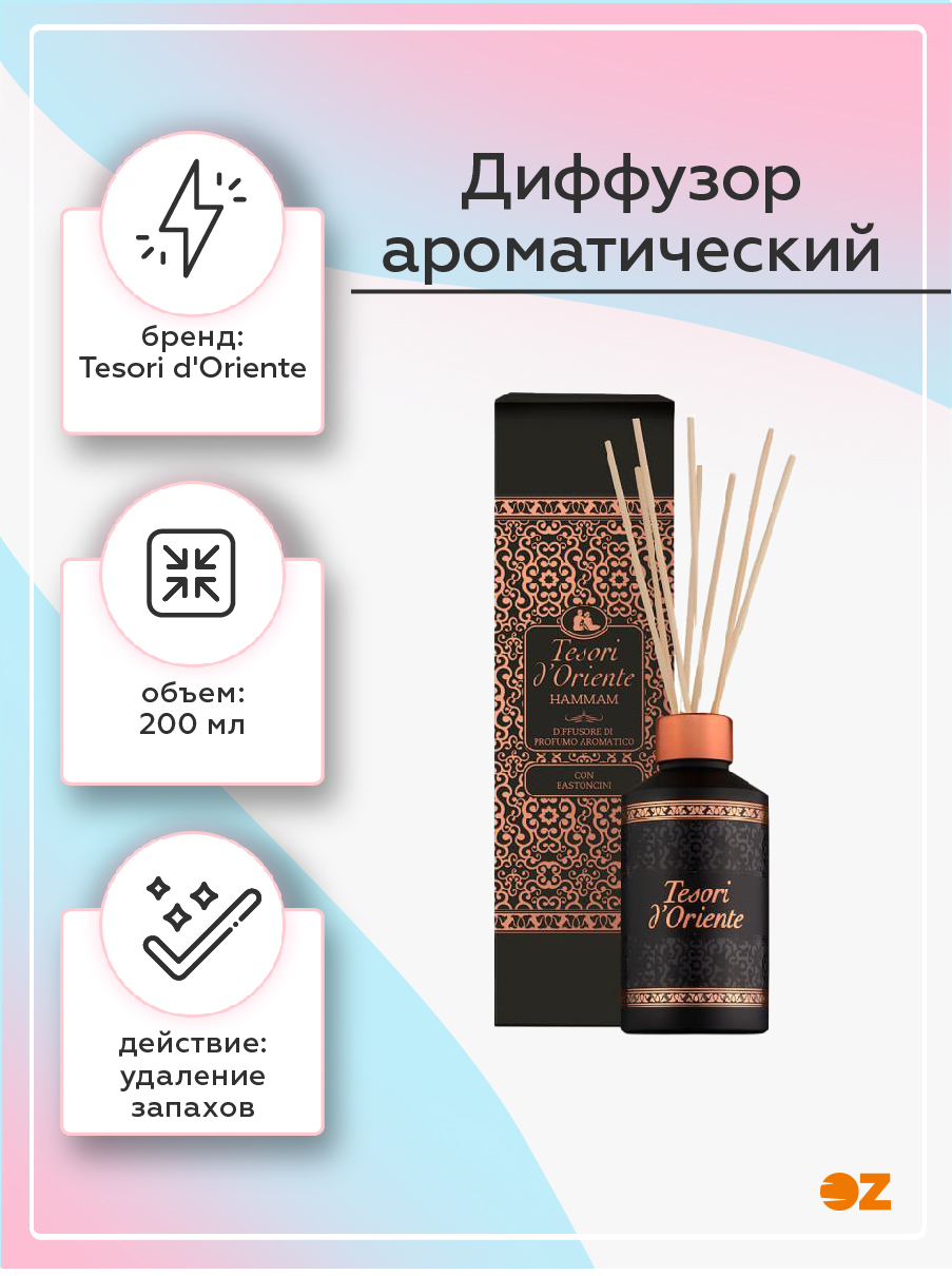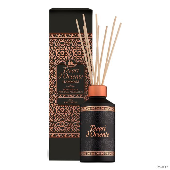 Диффузор ароматический "Hammam" Tesori d’Oriente приглашает Вас окунуться в мир эстетики и великолепия. Уникальная разработка итальянских парфюмеров создает аромадиффузор с палочками с ярким ароматом.