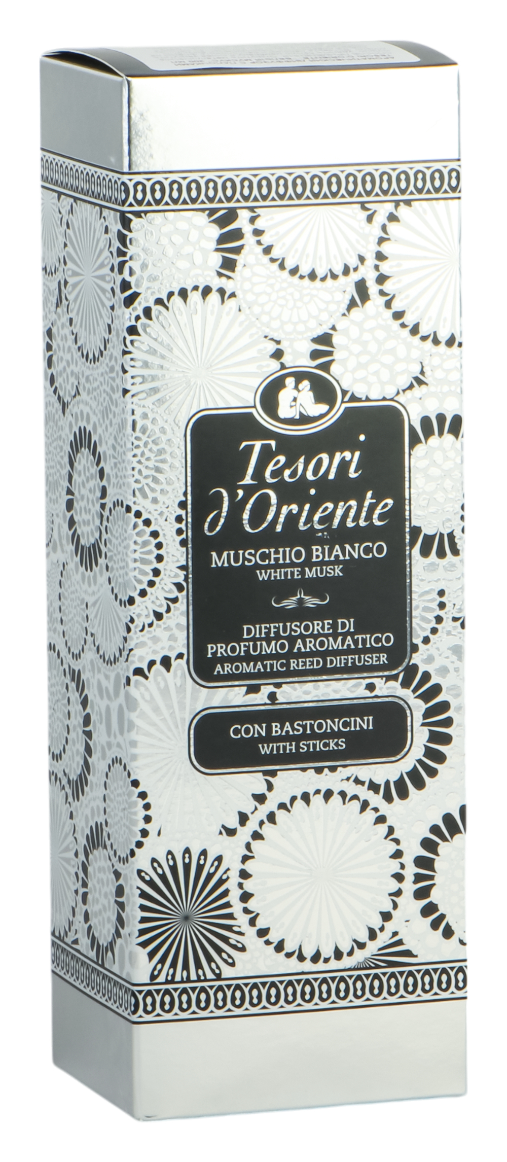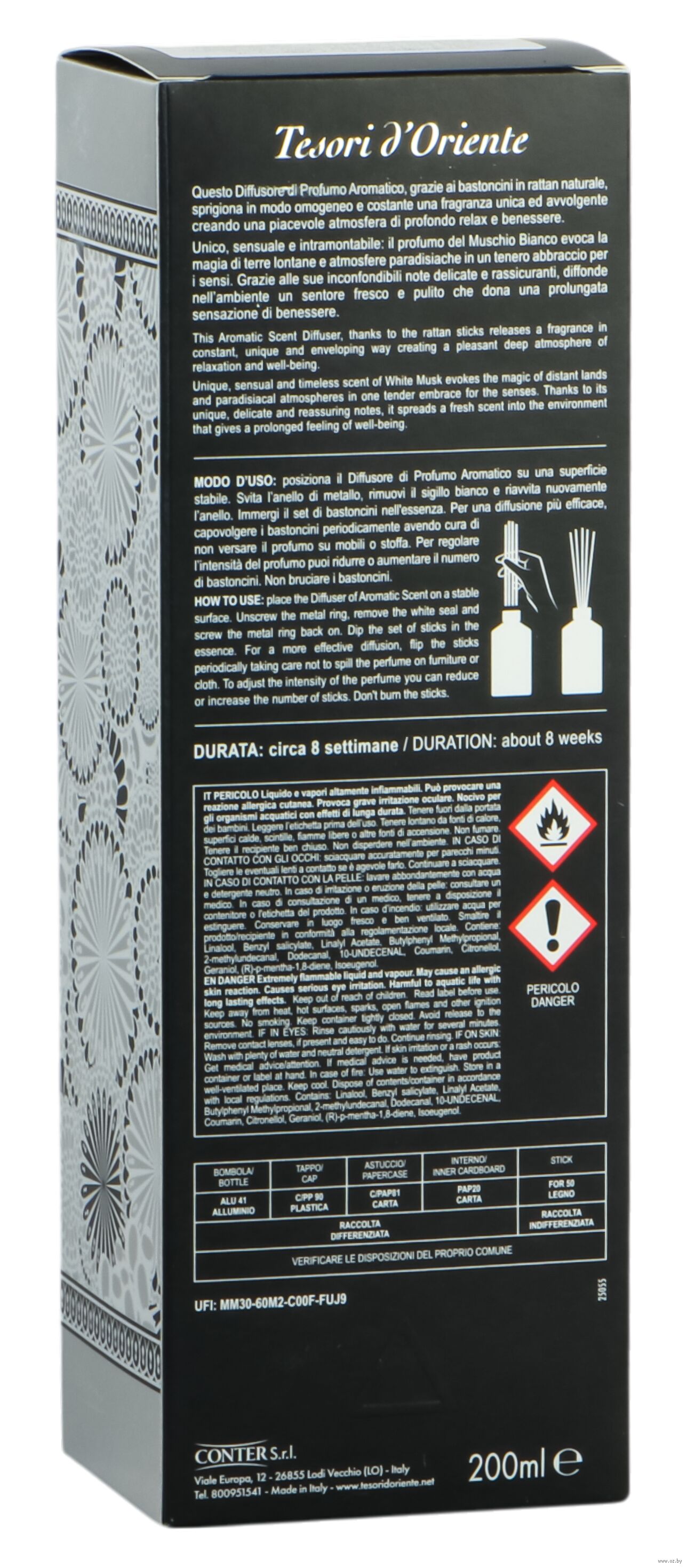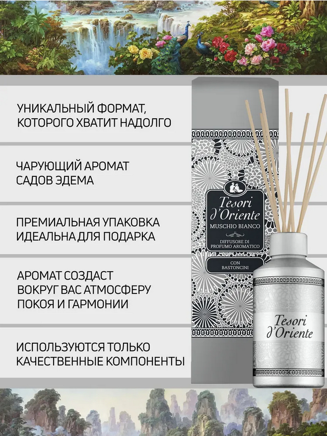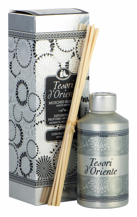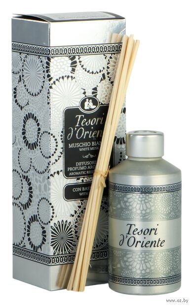Диффузор ароматический "Muschio Bianco" Tesori d’Oriente приглашает вас окунуться в мир эстетики и великолепия. Уникальная разработка итальянских парфюмеров создает аромадиффузор с палочками с ярким ароматом.
