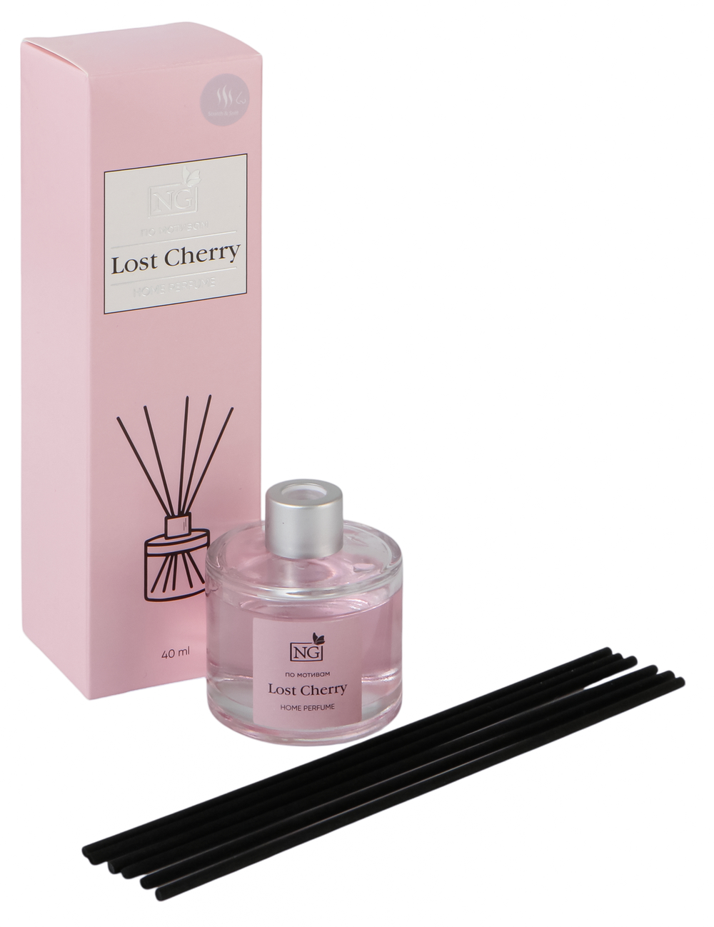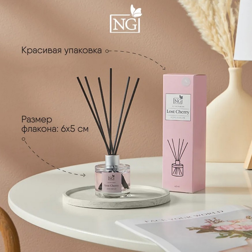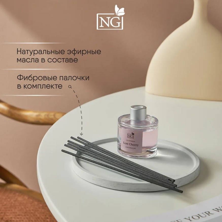Черные палочки из фибрового волокна деликатно распространяют аромат по всей площади, а стильный флакон станет частью декора.