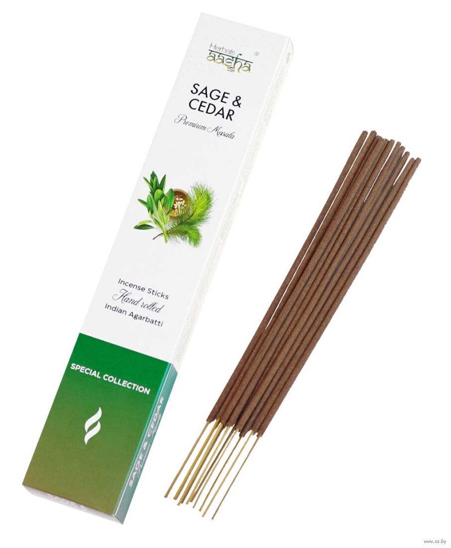 Ароматические палочки Шалфей и кедр Ааша Хербалс обладают травянистым ароматом, вызывающим чувство спокойствия и ясности, с древесными нотками, благодаря кедровому ладану, который успокаивает разум и тело.