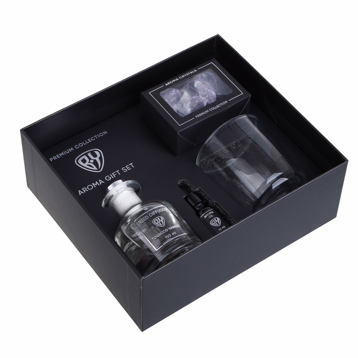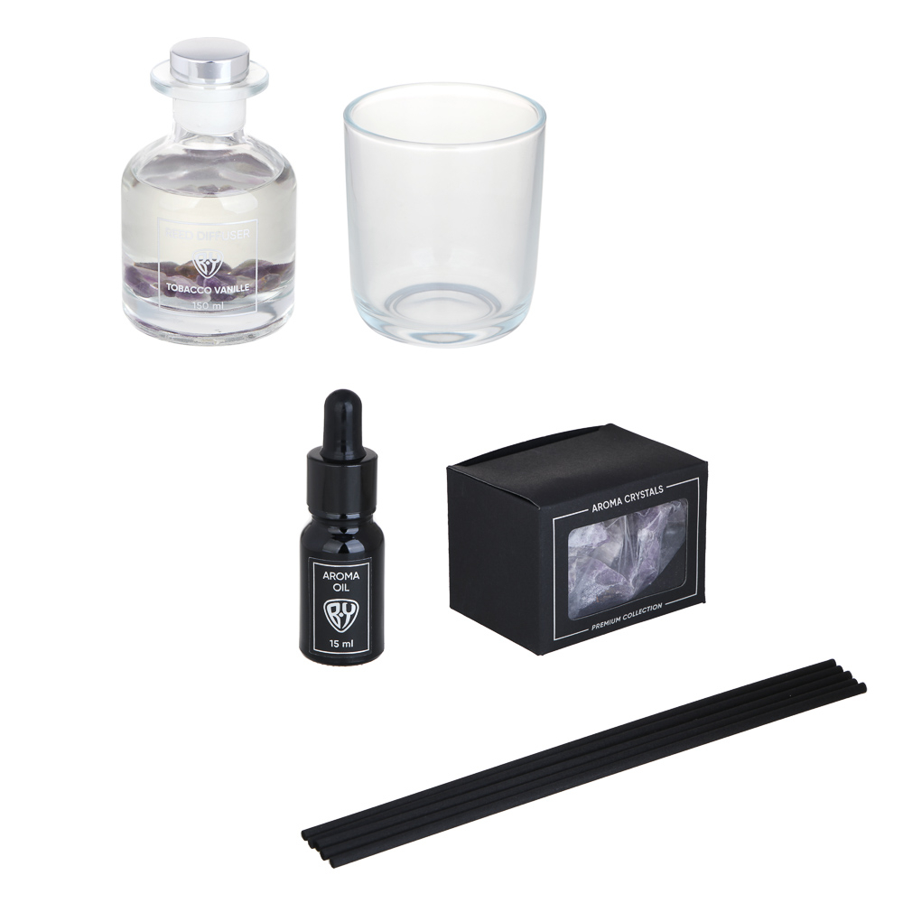 Подарочный набор включает в себя стильный диффузор объёмом 150 мл, аромакристаллы и парфюм с ароматом "Tobacco Vanille".