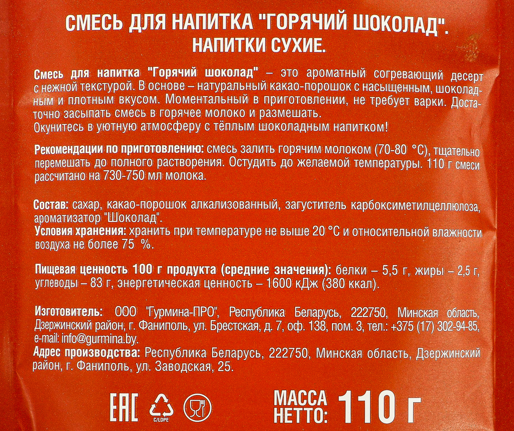 | Изготовитель | ООО "Гурмина", 220020, Беларусь, г. Минск, ул. Казинца, 92/1, пом. 15 |