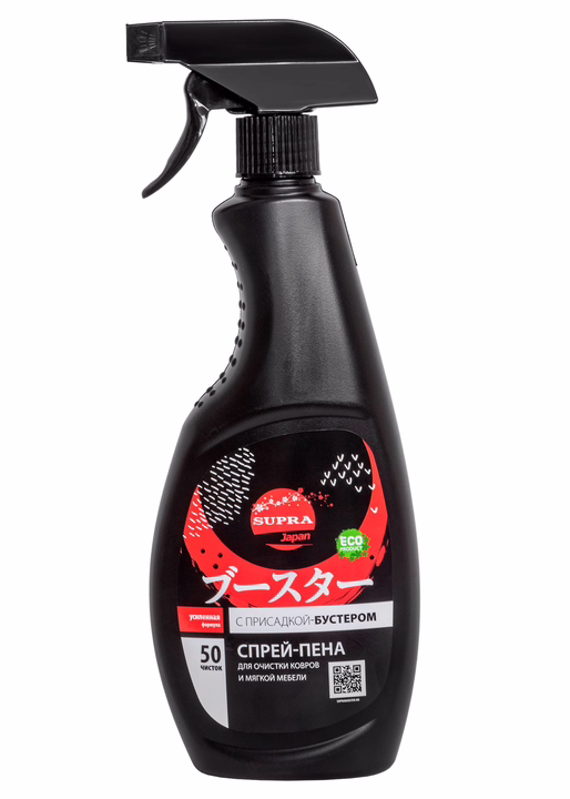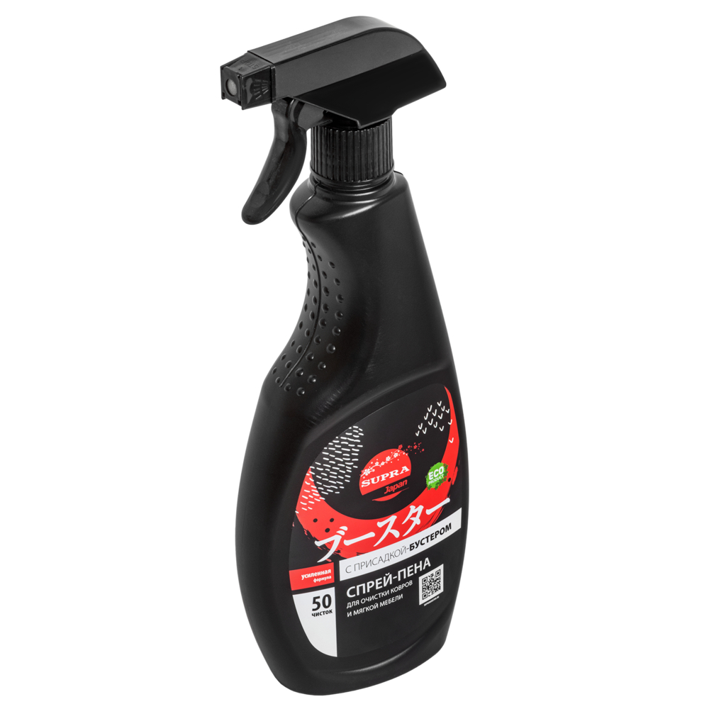 Спрей-пена для очистки ковров и мягкой мебели от Supra Booster. Особая формула на основе комплекса ПАВ растительного происхождения и запатентованной присадки-бустера эффективно очищает даже сложные загрязнения различного происхождения, сохраняя цвет и структуру тканей.
