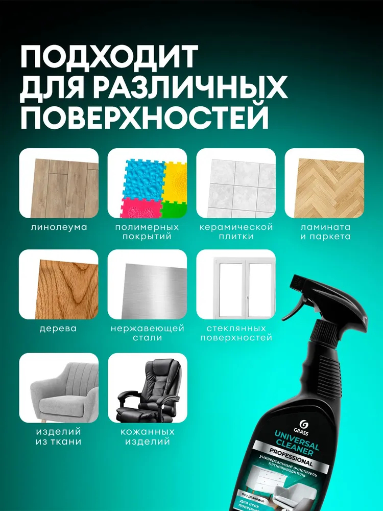 Универсальное чистящее средство широкого спектра действия. Эффективно удаляет различные загрязнения с водостойких поверхностей: линолеума, полимерных покрытий, керамической плитки, ламината, паркета, дерева, нержавеющей стали, стеклянных поверхностей, а также изделий из ткани и кожи, не повреждая волокон тканей. Эффективное средство для регулярной уборки, подходит и для сильно загрязненных поверхностей. Не оставляет разводов. Устраняет неприятные запахи.