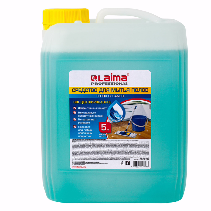Представляет собой концентрат весом 5кг. Нейтрализует неприятные запахи, не оставляет разводов. pH нейтральный, что позволяет чистить любые поверхности: линолеум, паркет, ламинат и т.д. Отдушка "Морской бриз". Средство работает в воде любой жесткости и температуры.