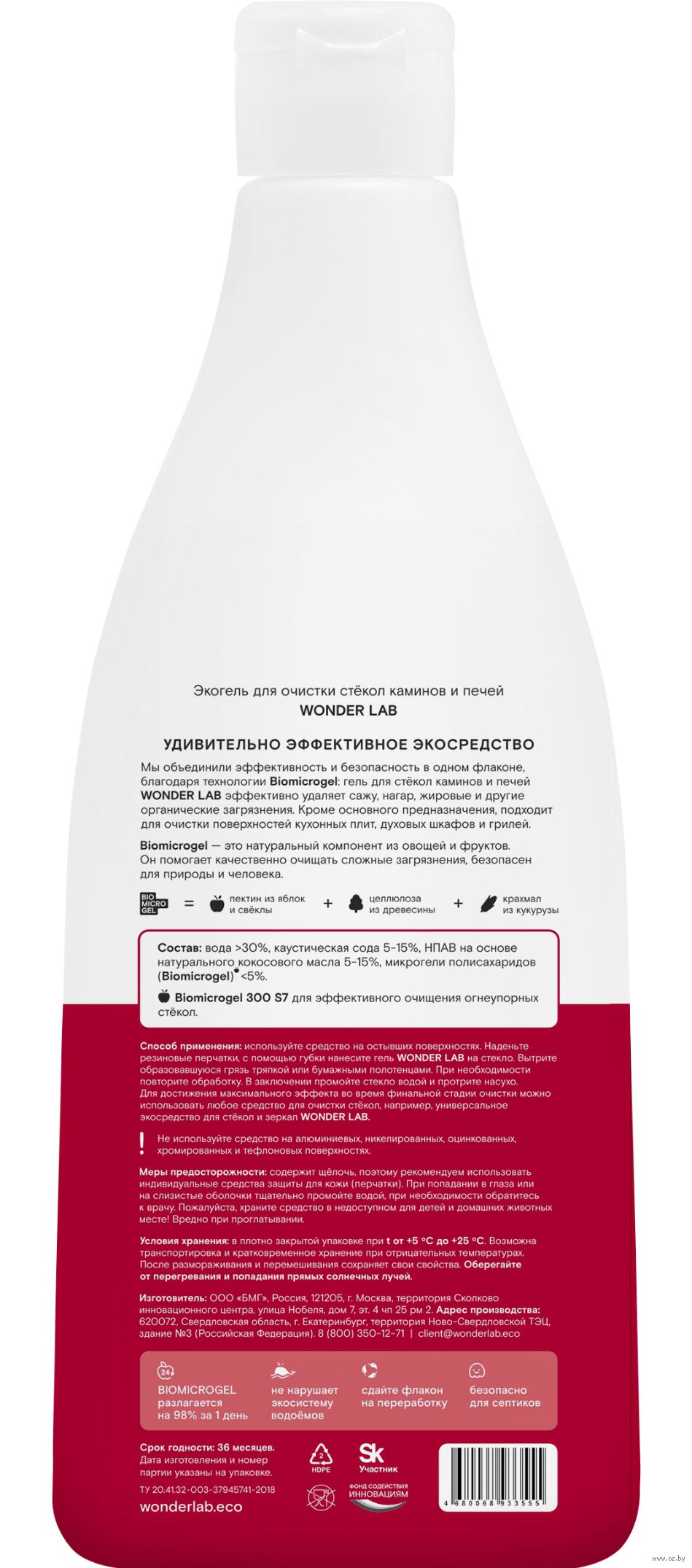 Средство не оставляет царапин и разводов, восстанавливает первоначальный блеск стекла, не имеет токсичного запаха. У геля экологичный состав, высокую эффективность которого обеспечивает инновационный компонент Biomicrogel из яблочного жмыха, свекольного жома и кукурузы.