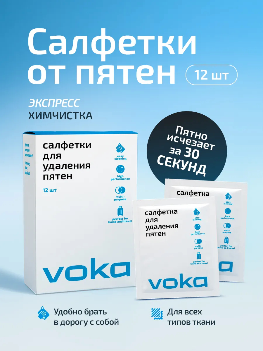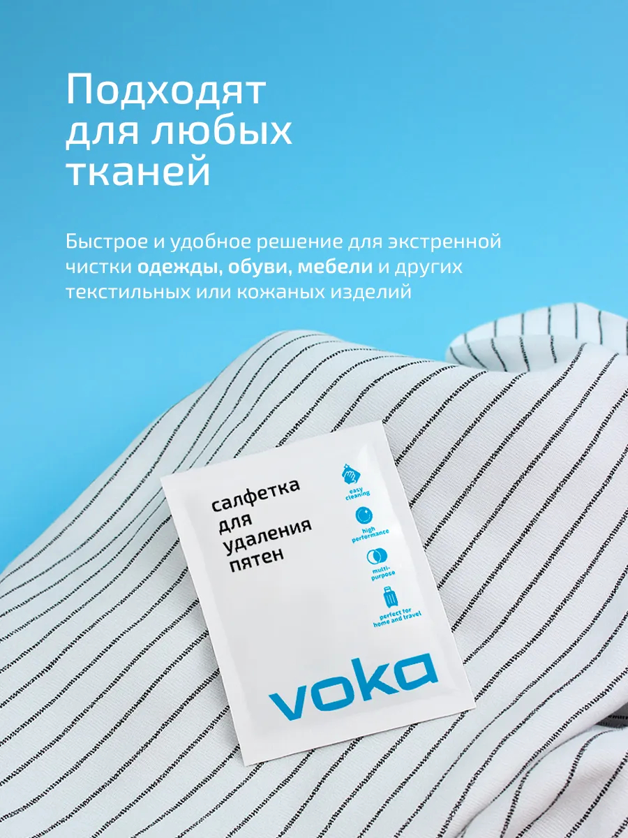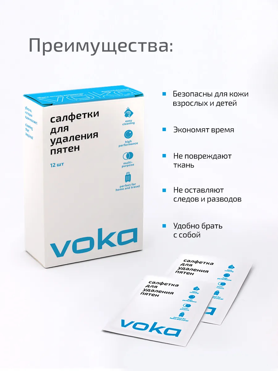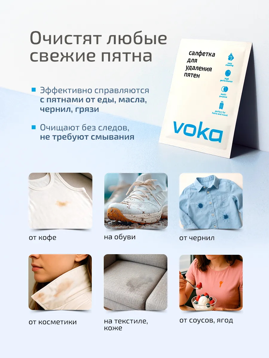Салфетки для удаления пятен VOKA – быстрый и удобный способ очистить одежду, обувь, мебель и другие текстильные или кожаные изделия. Средство эффективно справляется со свежими пятнами от кофе, масла, чернил, косметики, еды и других загрязнений. Не требует смывания и не оставляет разводов. Подходит для разных типов ткани и безопасно для кожи взрослых и детей.