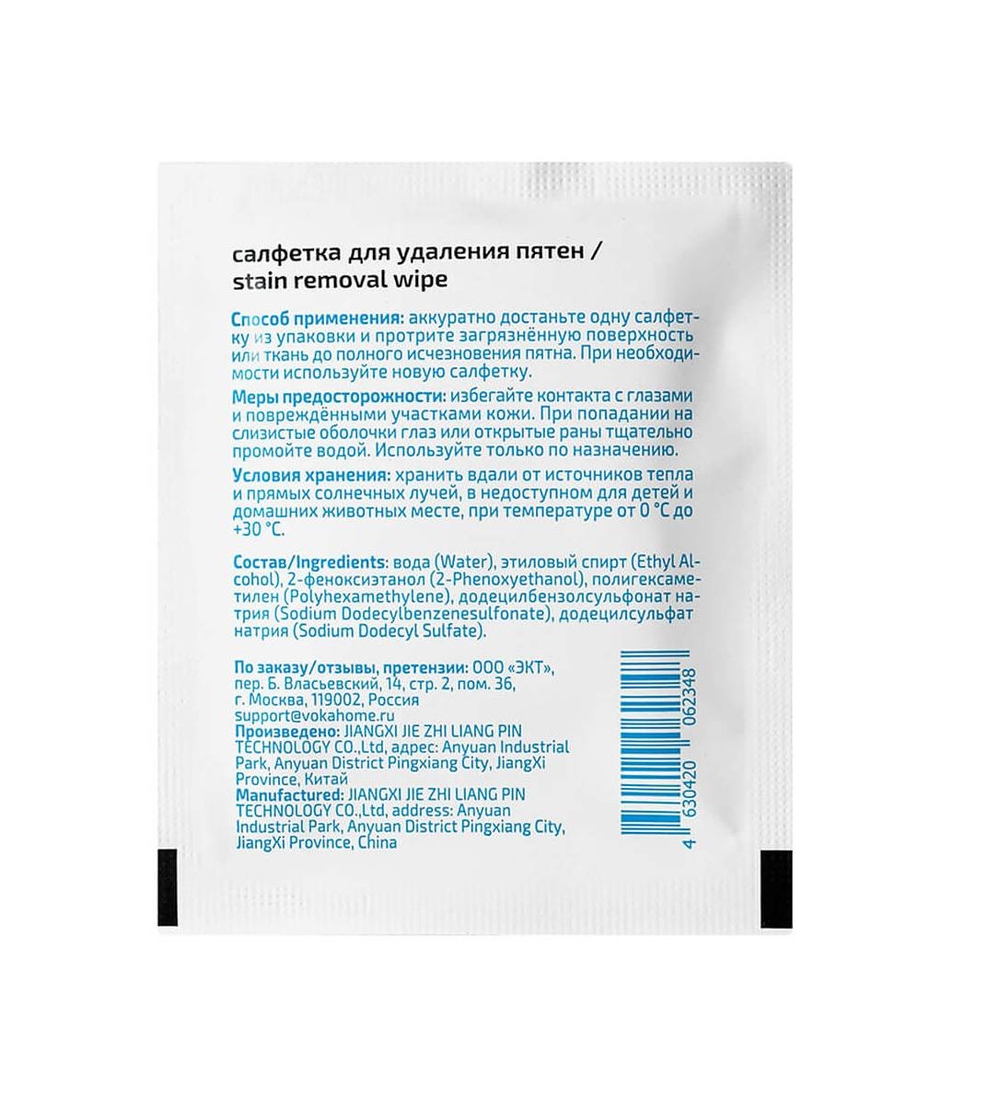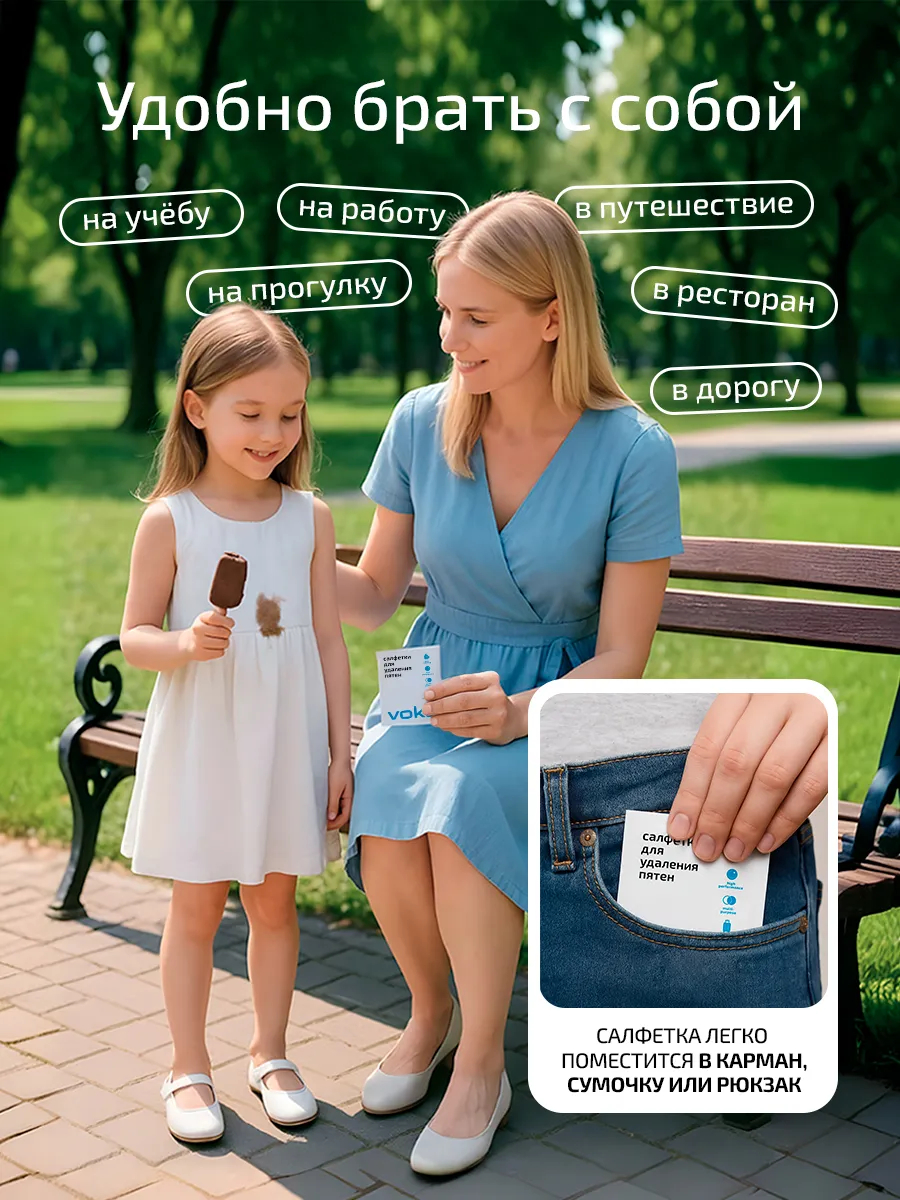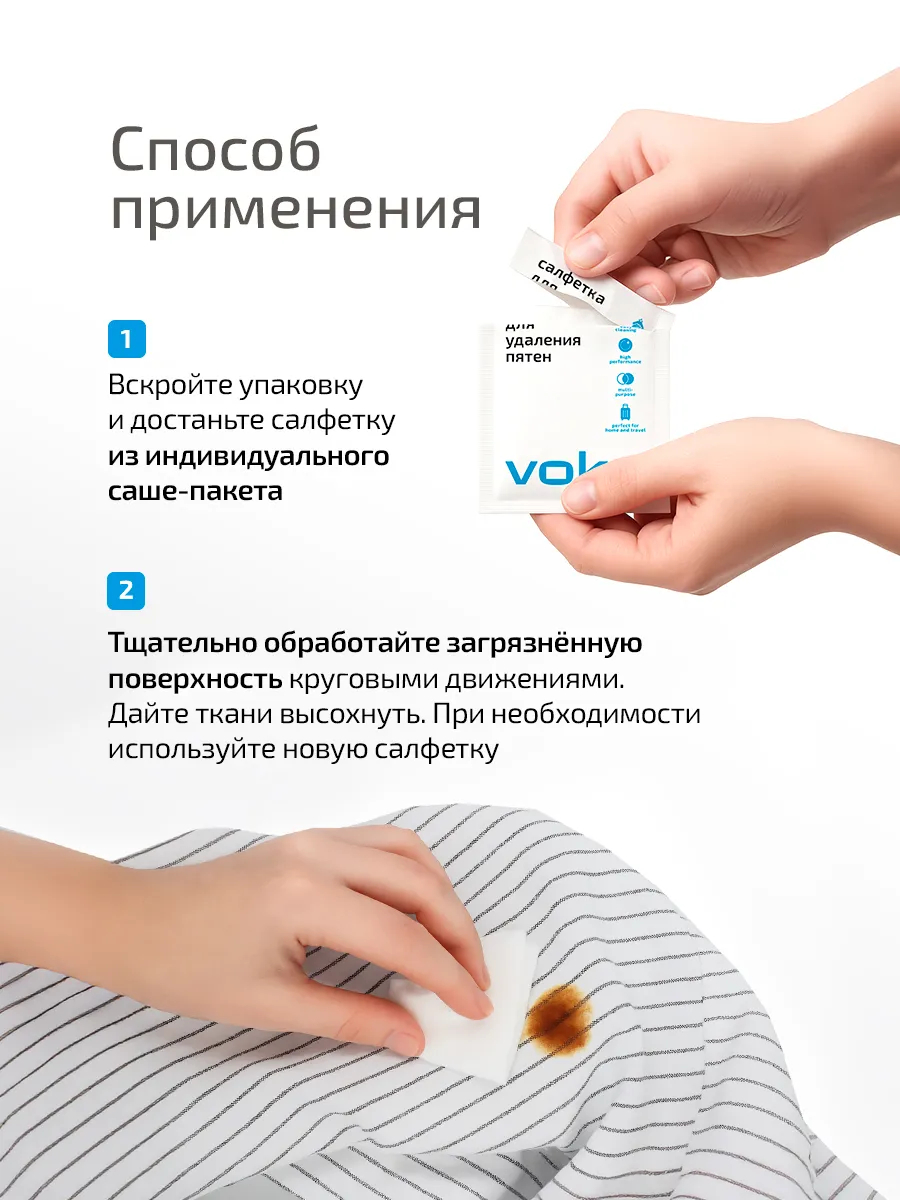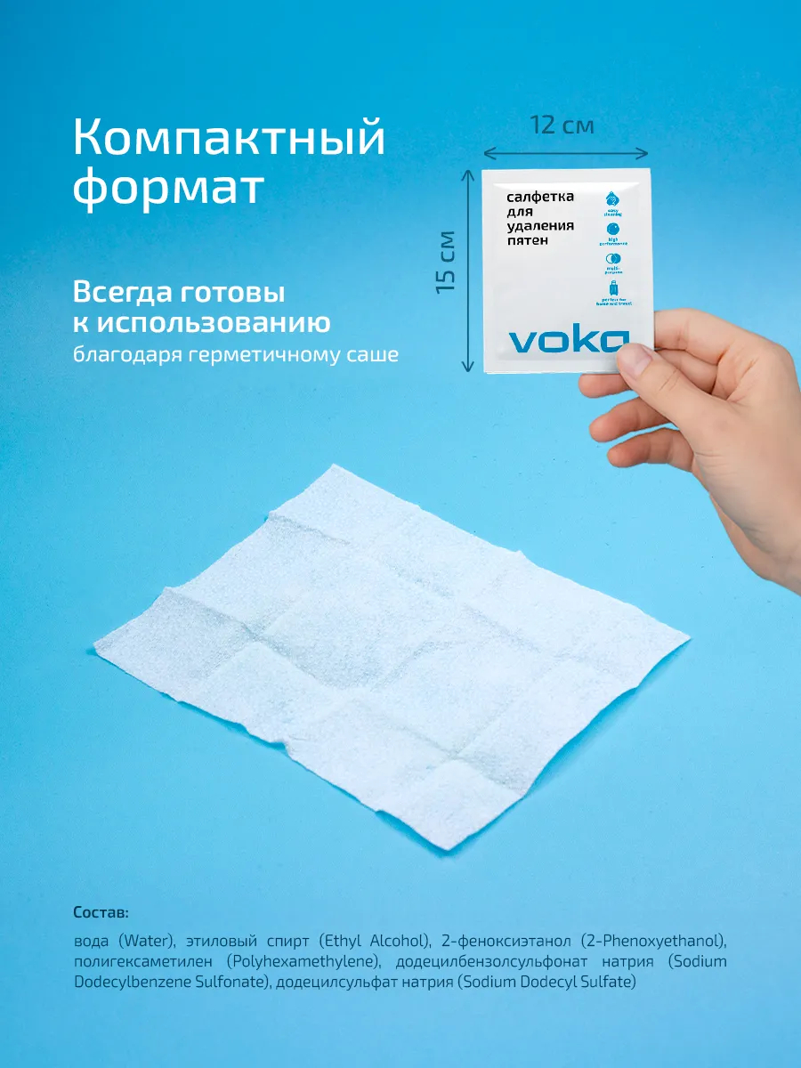 Салфетки для удаления пятен VOKA – быстрый и удобный способ очистить одежду, обувь, мебель и другие текстильные или кожаные изделия. Средство эффективно справляется со свежими пятнами от кофе, масла, чернил, косметики, еды и других загрязнений. Не требует смывания и не оставляет разводов. Подходит для разных типов ткани и безопасно для кожи взрослых и детей.