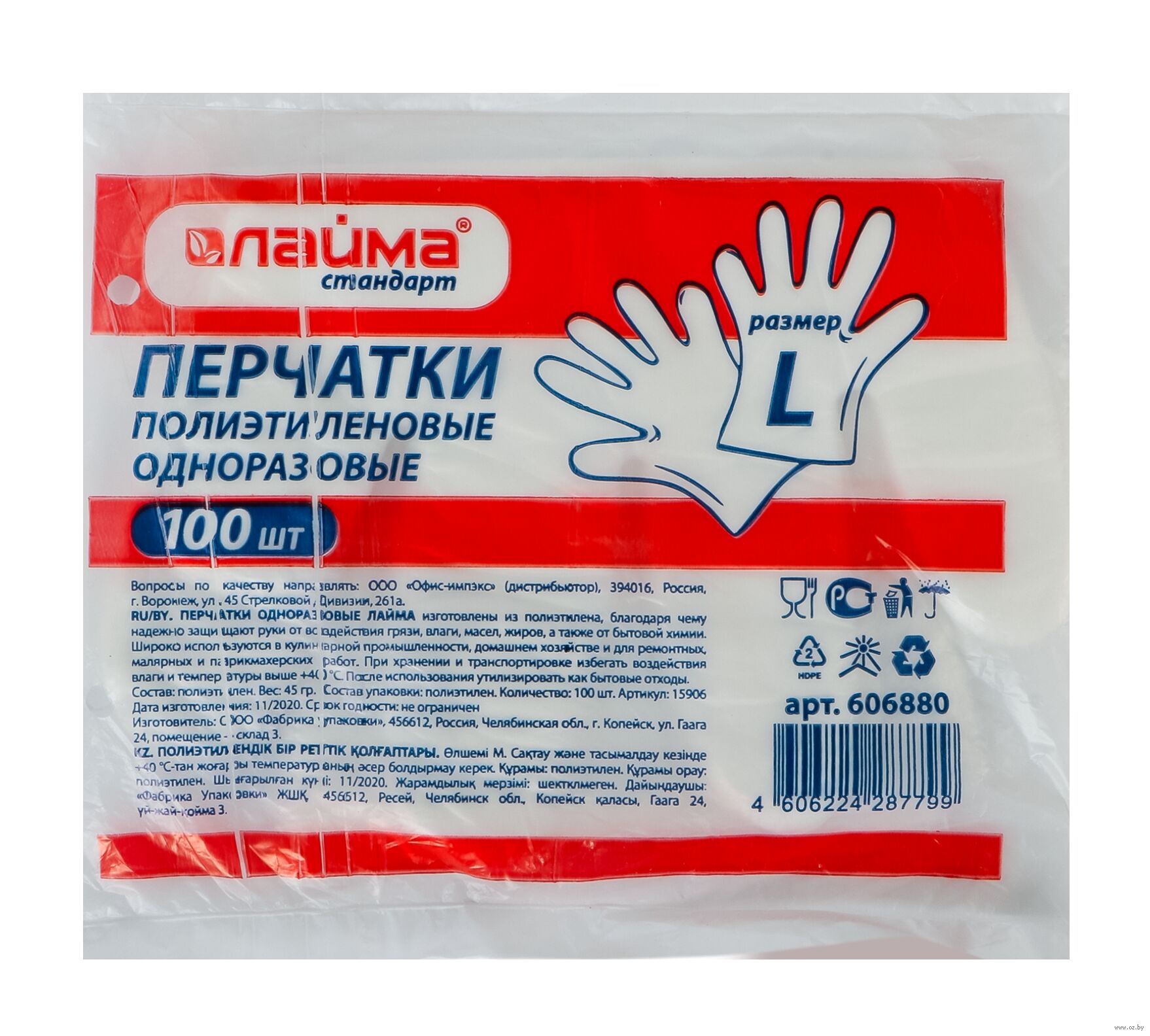 Одноразовые перчатки большого размера L выполнены из полиэтилена плотностью 6 микрон и имеют гладкий срез манжеты. Устойчивы к химическим средствам. Сохраняют тактильные ощущения. Отсутствие технической пудры на перчатках максимально уменьшает риск загрязнения как рук, так и продукции.