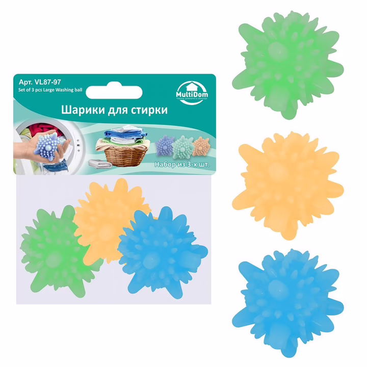 Шарики не позволяют наполнителю сбиваться в комок и постоянно в процессе всего цикла стирки, полоскания и отжима взбивают его. Имеют специальную ребристую поверхность, благодаря которой на бельё оказывается и механическое воздействие. Такие шарики придадут мягкость и пушистость вашим вещам, махровым изделиям-полотенцам и халатам.